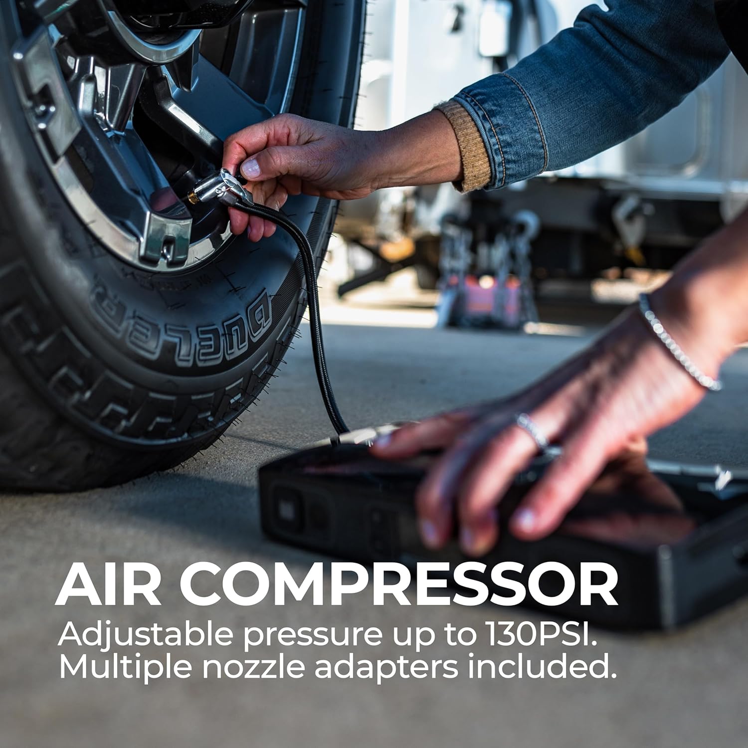 - Multi-Device Charging: Features a bi-directional USB-C port allowing for rapid recharging, a USB-A port, and a 130PSI air compressor. The Bolt Ultimate 2.0 can be charged at home or in a vehicle and it doubles as a portable power bank to recharge USB-powered devices and with the integrated AC inverter you’ll always have an outlet available for your laptop so you can work remotely off-grid