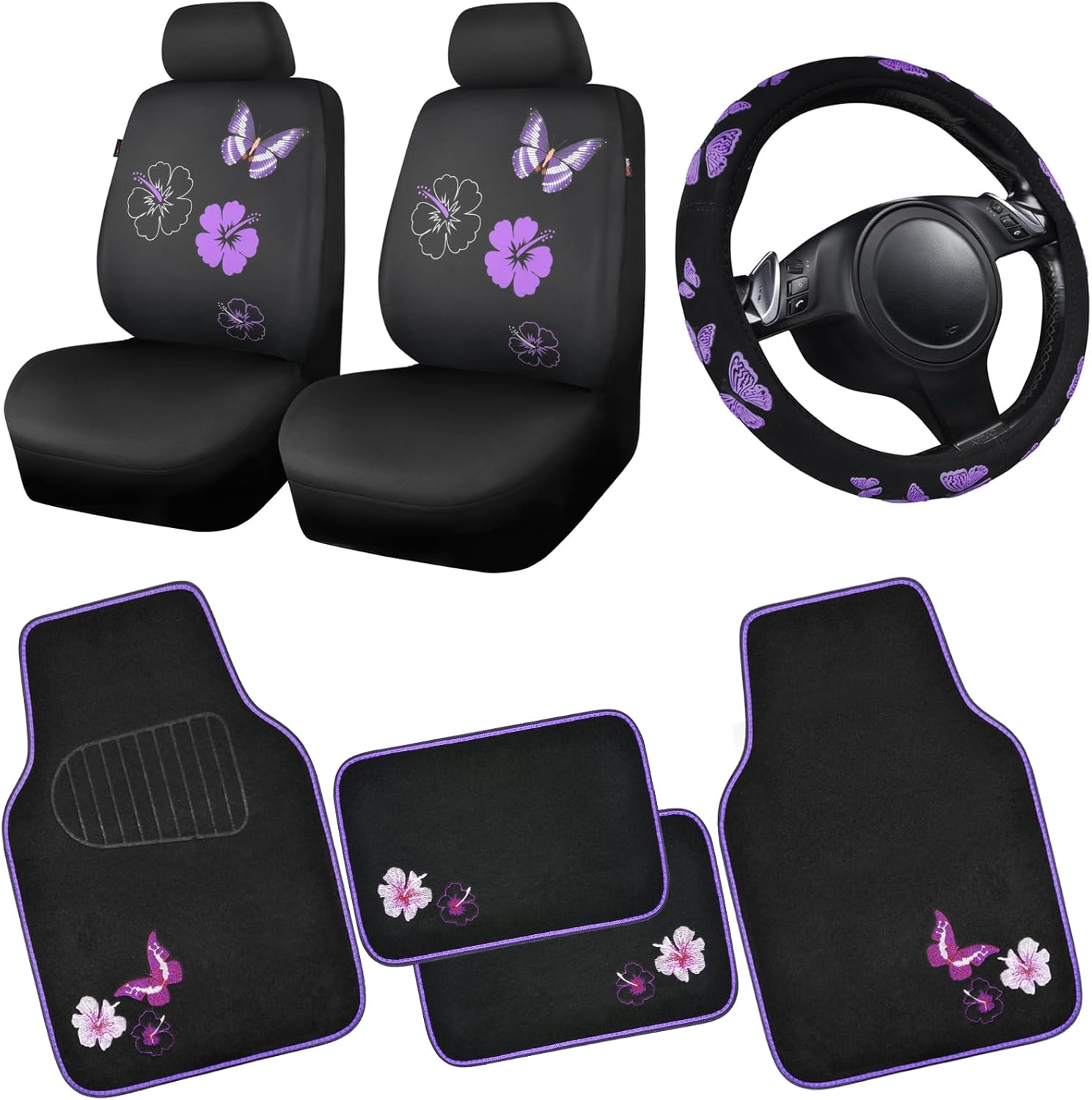 CAR PASS Universal Butterfly Car Seat Covers Front Set, Embroidered Flower Waterproof Car Floor Mats Carpet, Butterflies Steering Wheel Cover for Car Accessories Interior Sets (Black and Purple)