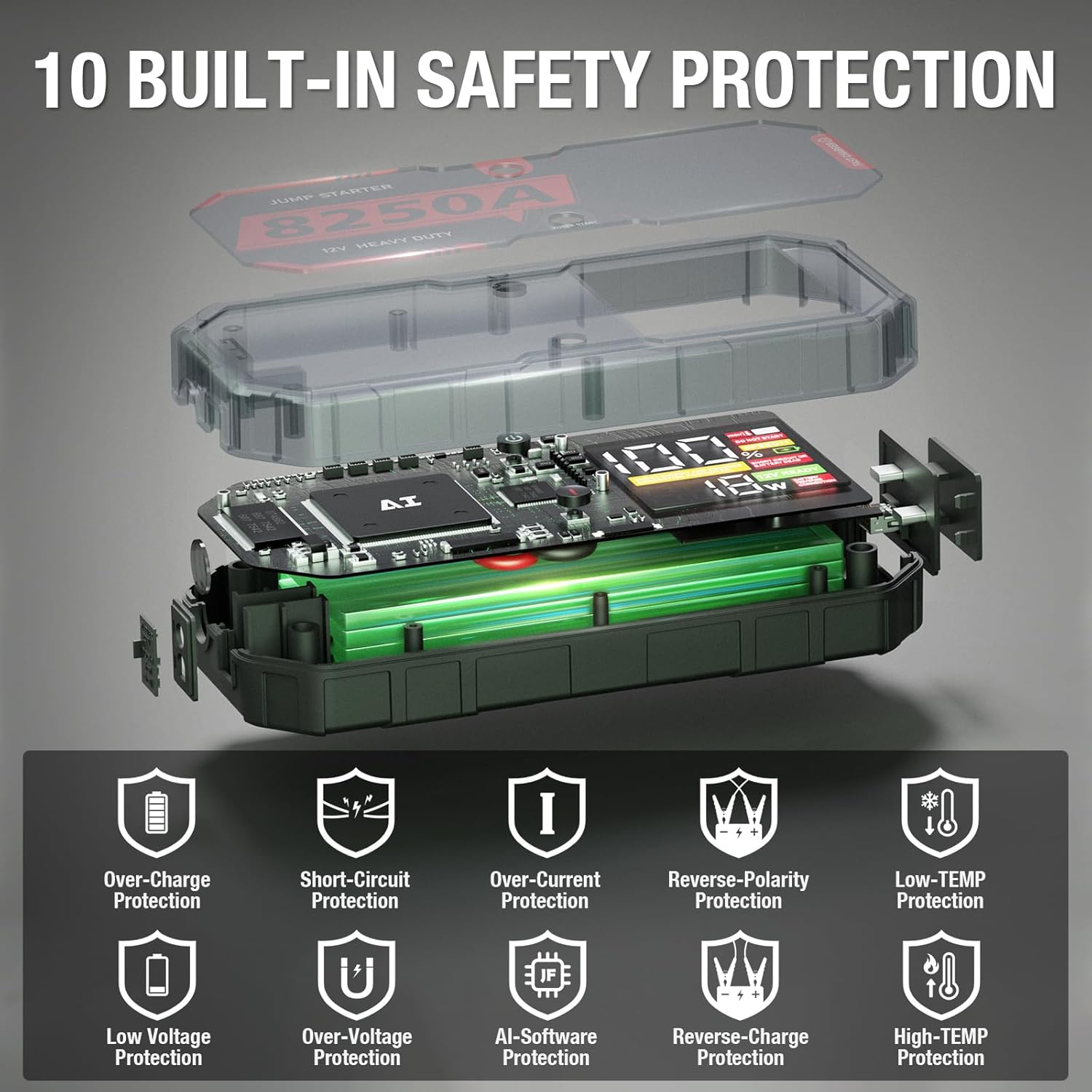 - ăSTART COMPLETELY DEAD BATTERIESă: This car jump starter delivers a powerful 8250 Amps peak current, capable of reviving completely dead batteries in vehicles up to 10L Gas/8L Diesel engines. With up to 60 jump starts on a single charge, this portable battery jump starter ensures you're never stranded.It jump starts almost every type of vehicle and equipment, including motorhomes, coaches, buses, mining, agricultural, construction, and vocational equipment - 6, 8, 12, and 16 cylinder - and more.NOT Suitable for Heavy Duty Truck.