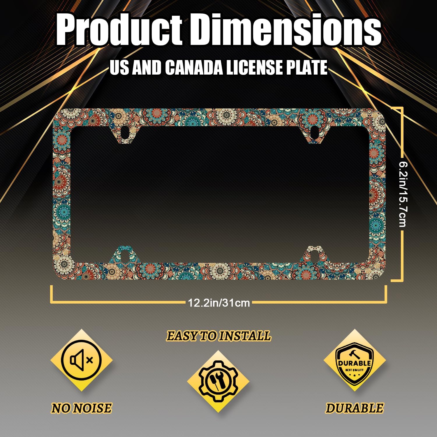 Vintage Mandala Flowers License Plate Frame Boho Floral License Plate Holder Funny License Plate for Car Decoration Stainless Steel Colorful Car Accessory with Screws Men Women 12.3" x 6.3"