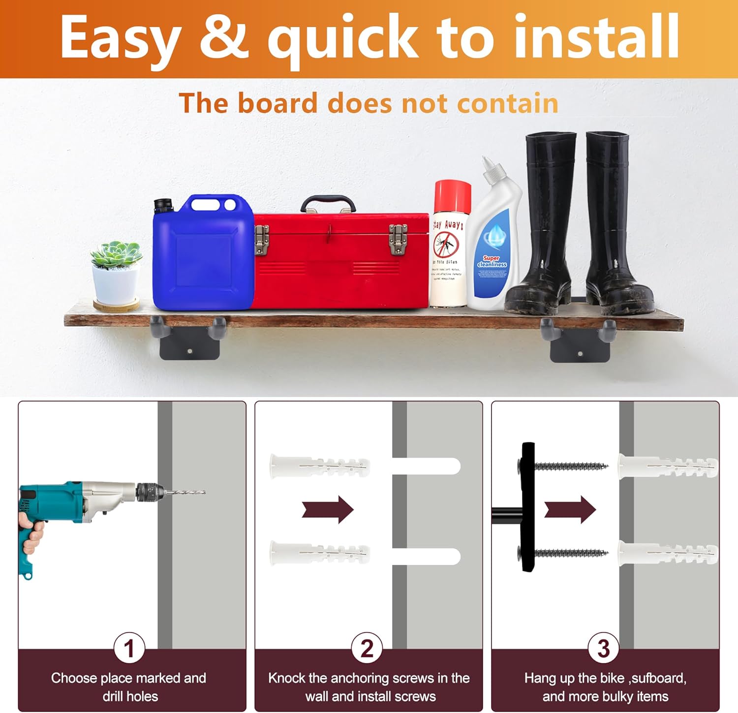 - Easy to install:You need an electric drill, and perhaps a level to ensure that it is lined up in a row for mounting on the studs on the wall. Important: Only install bike wall rack on a solid stud, beam, masonry or concrete wall. Do not install on ‘unsupported’ wall surfaces e.g. plasterboard wall unless there is a strong wooden stud behind it.(Includes all installation hardware.