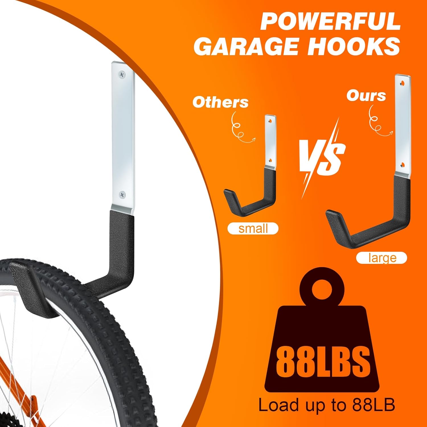 - QUALITY GARAGE HOOKS- BUY WITH CONFIDENCE: This metal garage wall hooks main body material is steel with a protective coating to reduce wear and tear on the tool. Each hook features two mounting holes for a secure installation and can support a maximum weight of 88 pounds.
