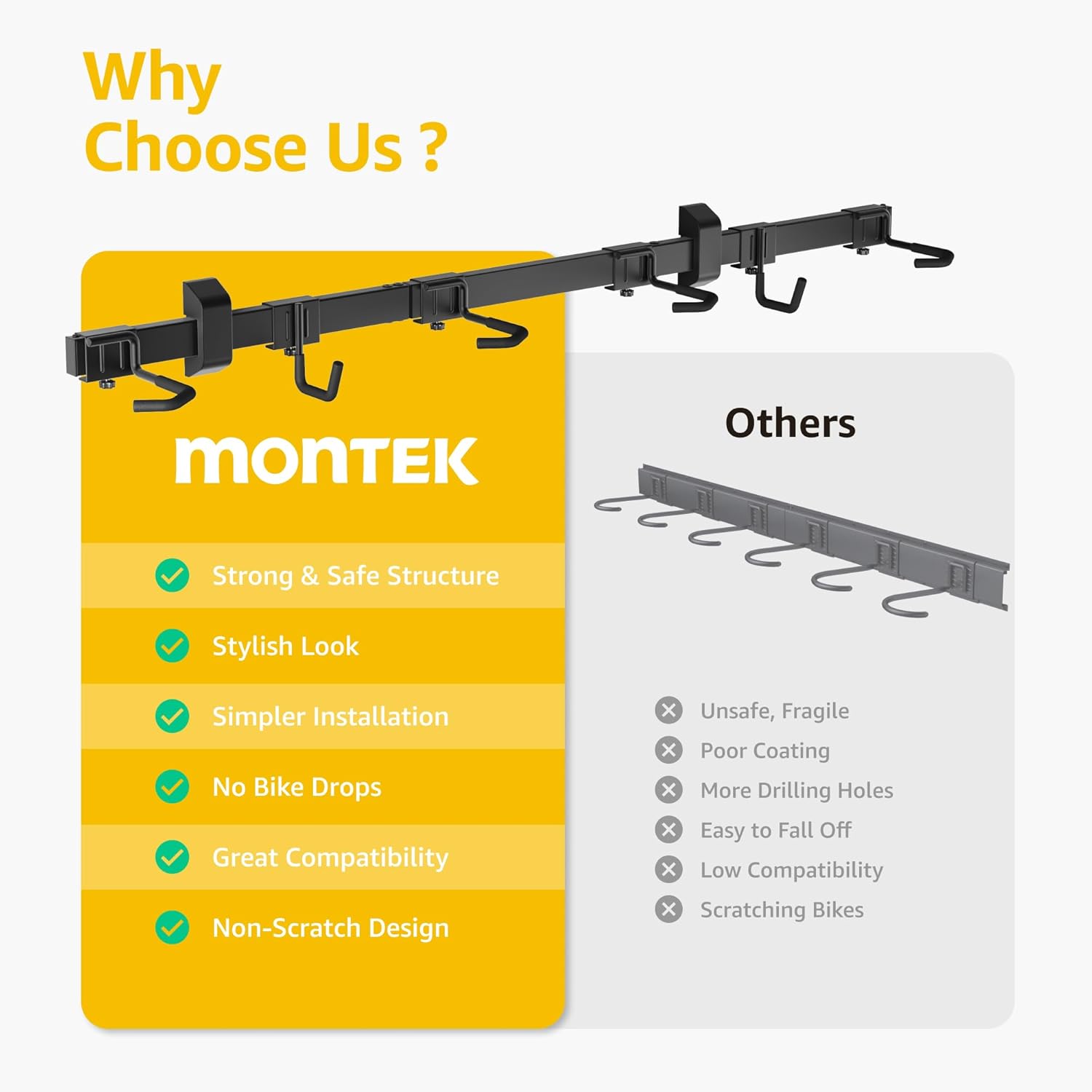 - 【PROFESSIONAL AFTER-SALE SERVICE】We are so confident in the quality of our wall bike mount that if you have any product issues, we're very happy to either provide a 100% Refund or a Replacement on your purchase! monTEK bicycle rack is designed by cyclists for cyclists and built to last. monTEK bike hanger wall mount is the best choice for the space saving storage feature you are looking for! Place the order NOW!