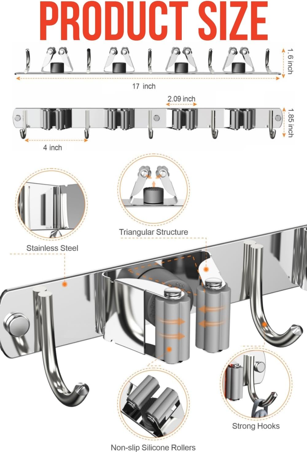 - STURDY: The broom organizer wall mount is made of premium quality stainless steel which is stronger than plastic material, corrosion-resistant, rustproof and waterproof. Broom and mop holder can hold items up to 30 lbs