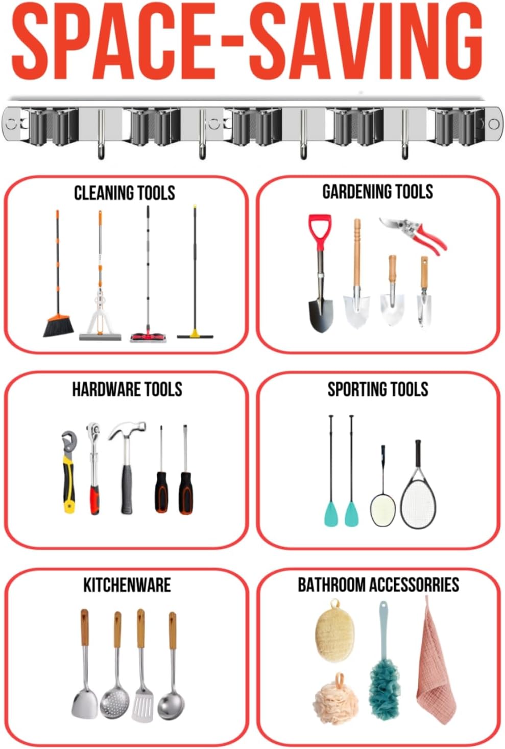 - SAVE SPACE: The wall hangers for brooms and mops provides you easy access to store and grab brooms, dustpans, mops. This tool organizer with 5 gripers and 4 utility hooks allows you to hold brooms, mops, brushes, rakes, garden tools, etc
