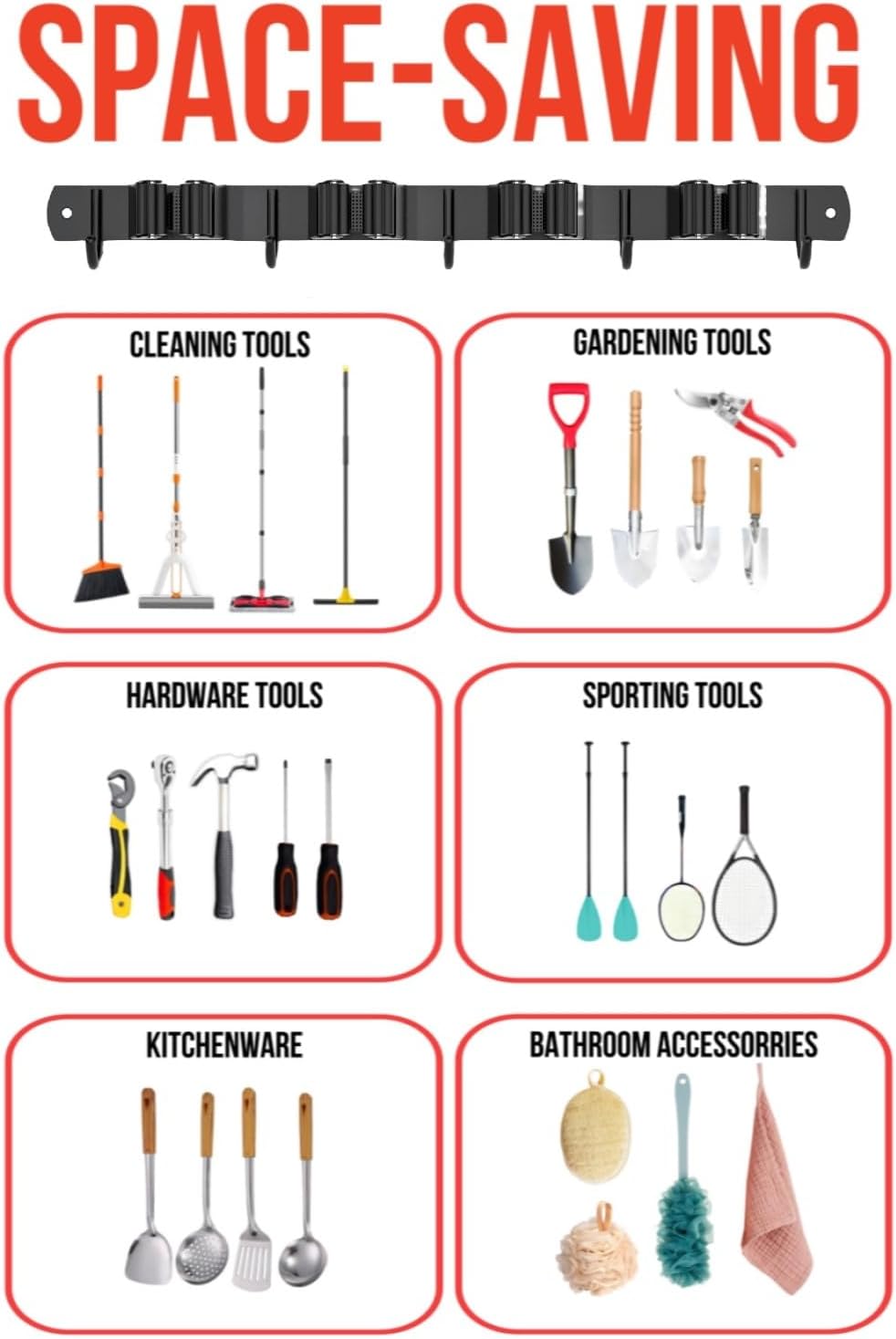 - WIDE APPLICATIONS: The broom storage organizer is designed to hold various household objects to save space and decorate. You can easy access your broom, mop, swifter, dust pan, small vacuum, brushes, gloves, rakes, shovels and more