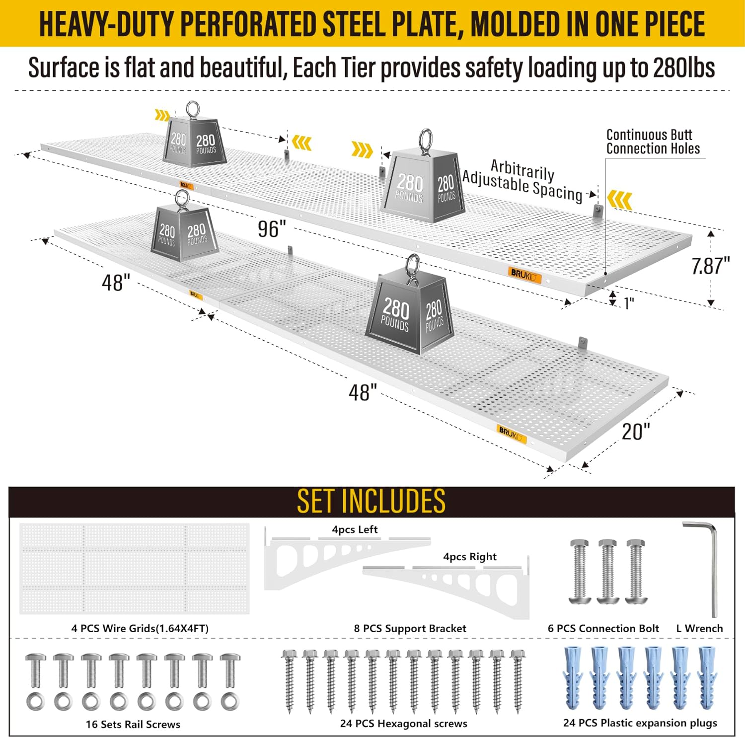 - KIT INCLUDES: Includes 4pcs of face plate; 8 Brackets; 24 Hexagonal screws (Hardened β 0.2" L/2"); 24 plastic expansion plugs, 16 Sets of rail attachment bolts; 1 L-wrench; 1 installation manual. All the hardware of Brukid professional series wall mounted shelves are under strict quality control and testing, we strive to provide our customers with a quality shopping experience, when you receive the product encountered any problems, please contact us at the first time, we will certainly give you a satisfactory solution