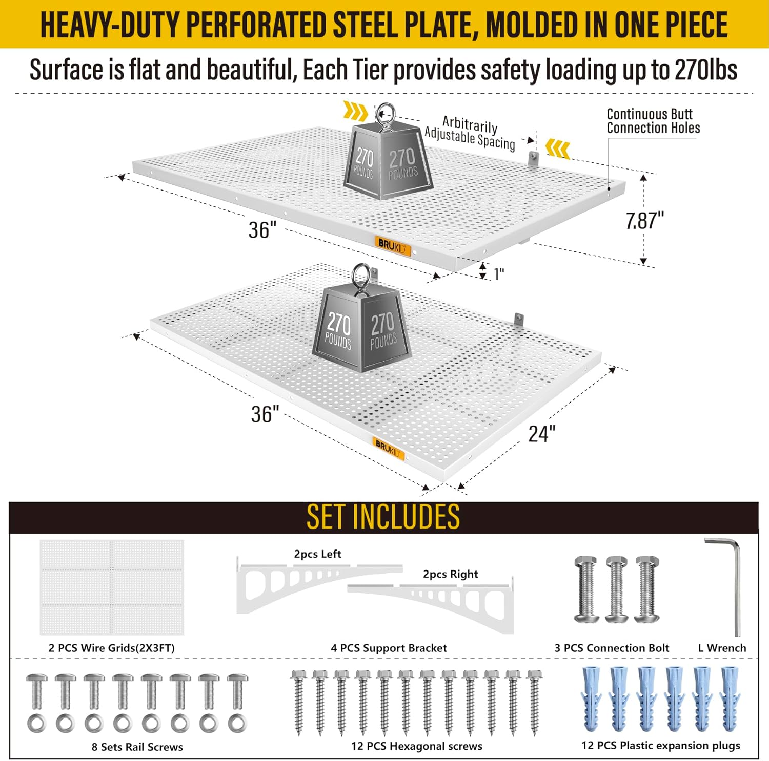 - STABLE AND SAFE: The storage rack is reinforced and safely designed for each connecting pivot point, abandoning the simple and rough wire mesh frame, using the whole piece of perforated steel plate molded in one piece, the whole is solid and beautiful, with a single piece of safe load-bearing capacity up to 270 pounds; allows you to organize and categorize messy and scattered items in an orderly manner, expanding your use of the space and making your garage/storage room more neat and tidy, perfect for walls in garages, storerooms, living rooms, kitchens, and other indoor spaces