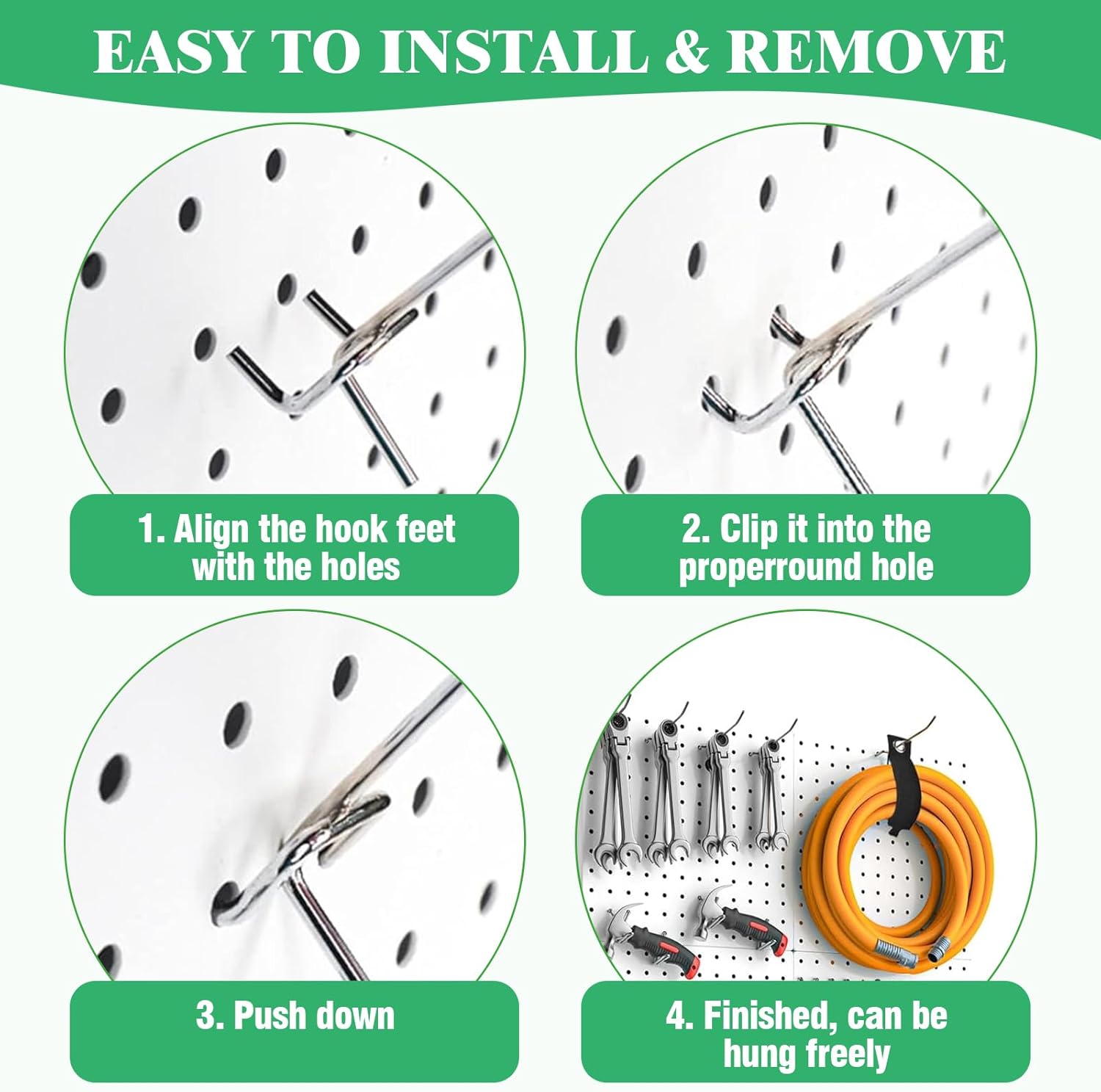 - [Thick Steel & Durable Material] Our pegboard hooks for hanging are made of thick & solid stainless steel with galvanizing plated to provide maximum strength and corrosion & rust resistance. Each pegboard hook is load-bearing to 20lb, allowing years of use without bending or warping.