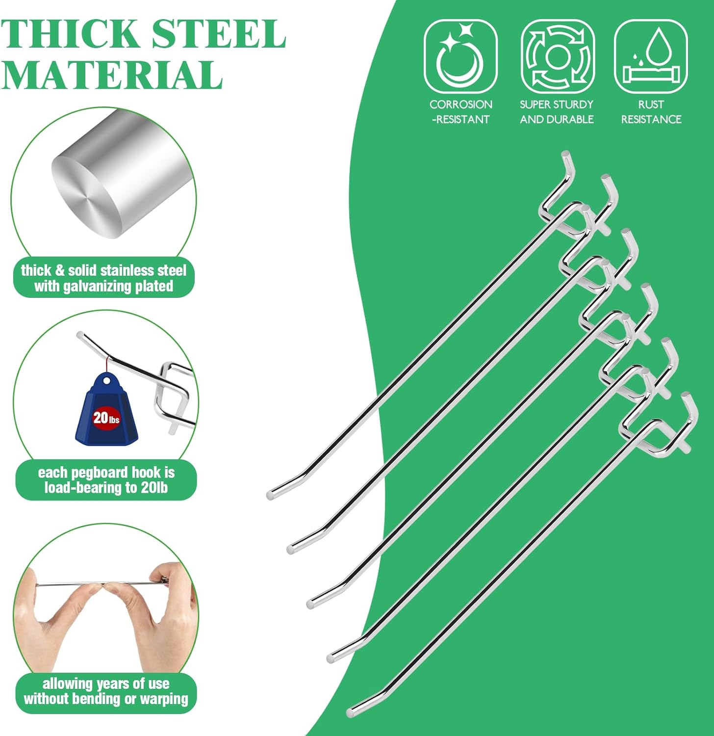 - [Thick Steel & Durable Material] Our pegboard hooks for hanging are made of thick & solid stainless steel with galvanizing plated to provide maximum strength and corrosion & rust resistance. Each pegboard hook is load-bearing to 20lb, allowing years of use without bending or warping.