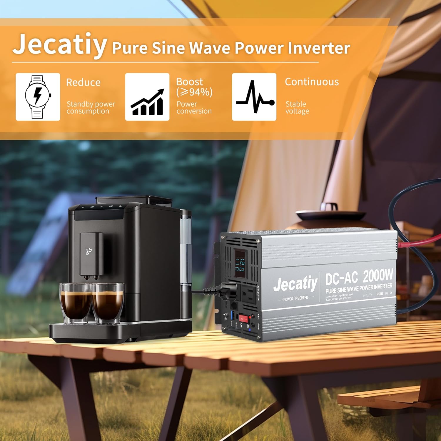 - ă2000W Pure Sine Wave InverterăJecatiy upgrade fully 2000W Power Inverter provides a continuous PURE SINE WAVE power of 2000W, with a peak surge of 4000W during load start-up. Tip: It can handle most appliances for you (including refrigerators, microwaves, or some power tools), as well as low-power devices. Note: The voltage of 110V is the actual display, and 100-120V is the supported range of the application