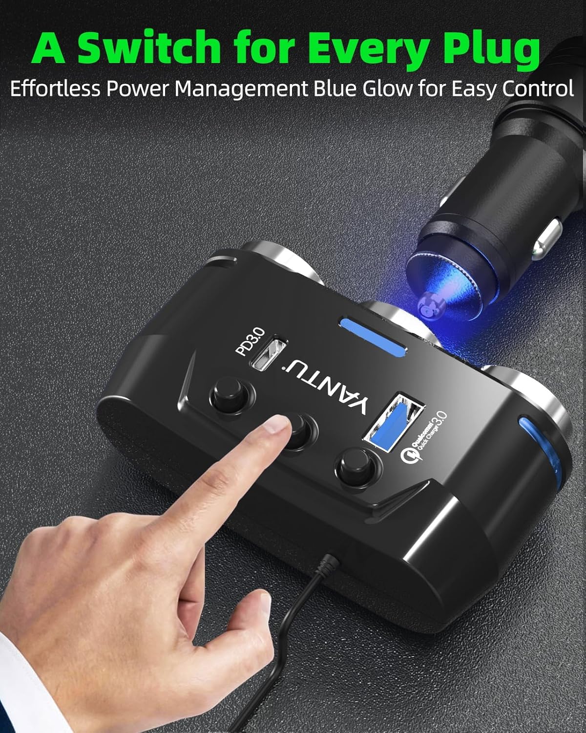 - ăBlue LED Lights & 40W Super Fast Charging Cigarette Lighter Splitteră Illuminate your vehicleâs interior with the stylish blue LED lights of this Cigarette Lighter Adapter. Featuring a total 40W super-fast charging capability with QC3.0 and PD3.0 ports, This Car Charger Adapter utilizes Smart IC technology to detect your devices and deliver optimal charging speeds. The Cigarette Lighter Splitter not only enhances visibility but also keeps your devices powered up efficiently.