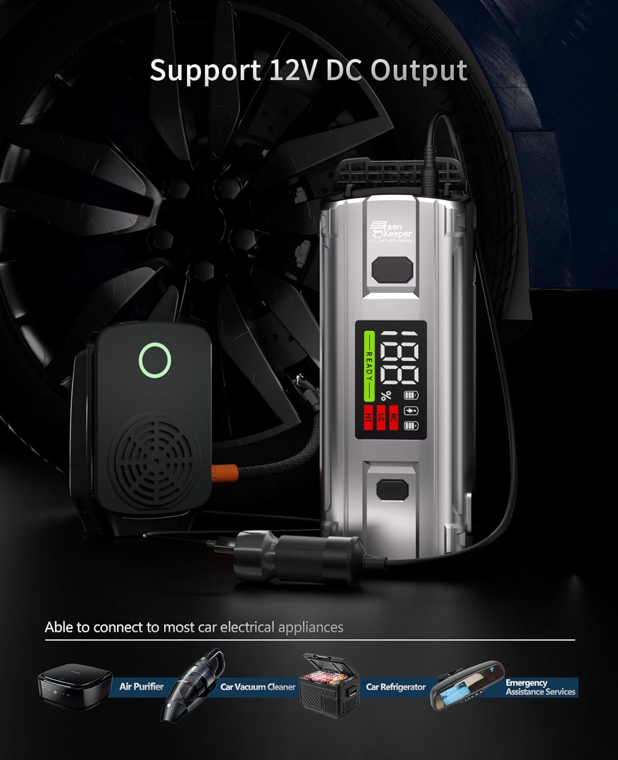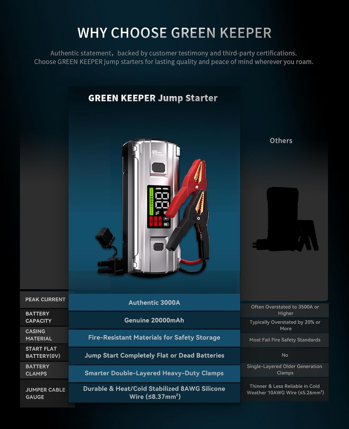 - Premium Battery Jumper Starter: Green Keeper Jump Starter offers portable jump starting experience with peak current of 3000A, suitable for engines up to 8.0L Gas / 8.0L Diesel. This GK-J1203 can jump start up to 45 times with one full charge depending on the car engine - reliable car jump starter is an essential companion for unexpetected roadside dead battery strikes.
