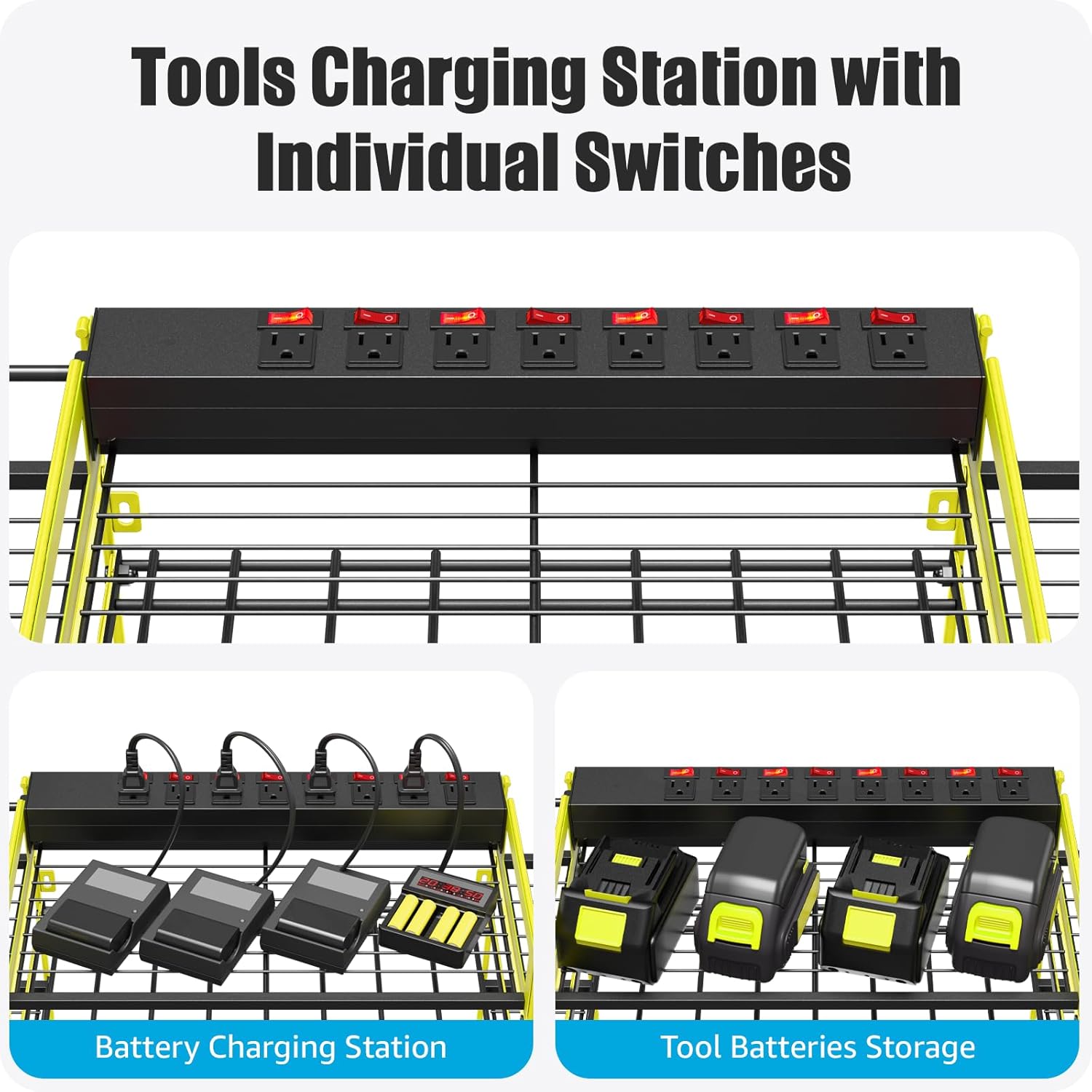 - Very convenient for charging your tool batteries, tools rack built-in metal 8 outlets with separate switch, avoids the hassle of unplugging and unplugging repeatedly. with surge protection of 1200J, Able to protect your device to a certain extent. Utility rack size: L:38.8in * W:9.4in * H:16.5in. Can be mounted on wall.