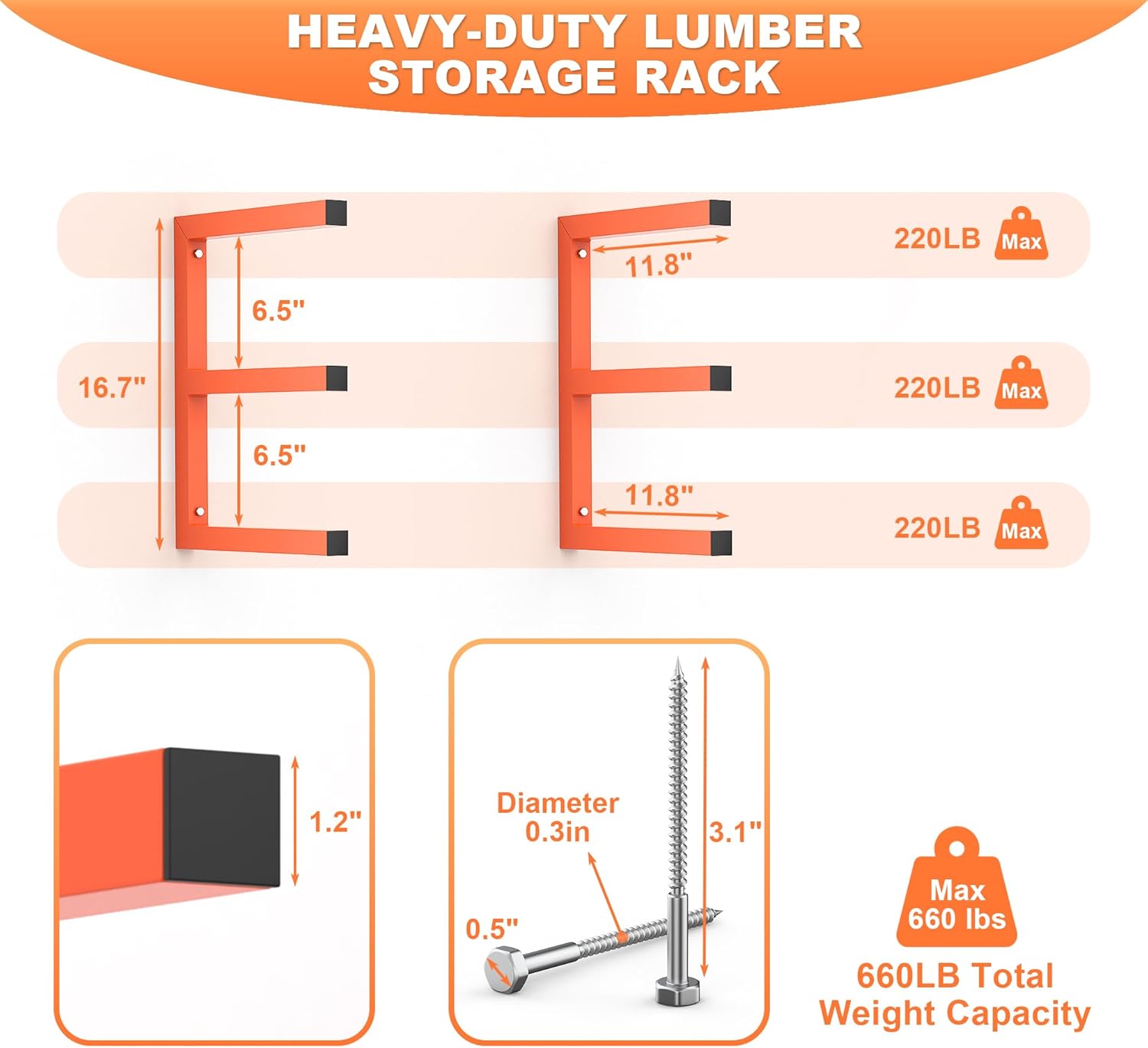 - Heavy Duty Lumber Storage Rack - The Ultrawall lumber storage rack is crafted from high-quality steel with a smooth powder-coated finish. Its exceptionally strong welds provide excellent load-bearing capabilities, ensuring high reliability. This allows each layer can support up to 220 lbs, with a total weight capacity of 660 lbs and remain intact even with long-term use.