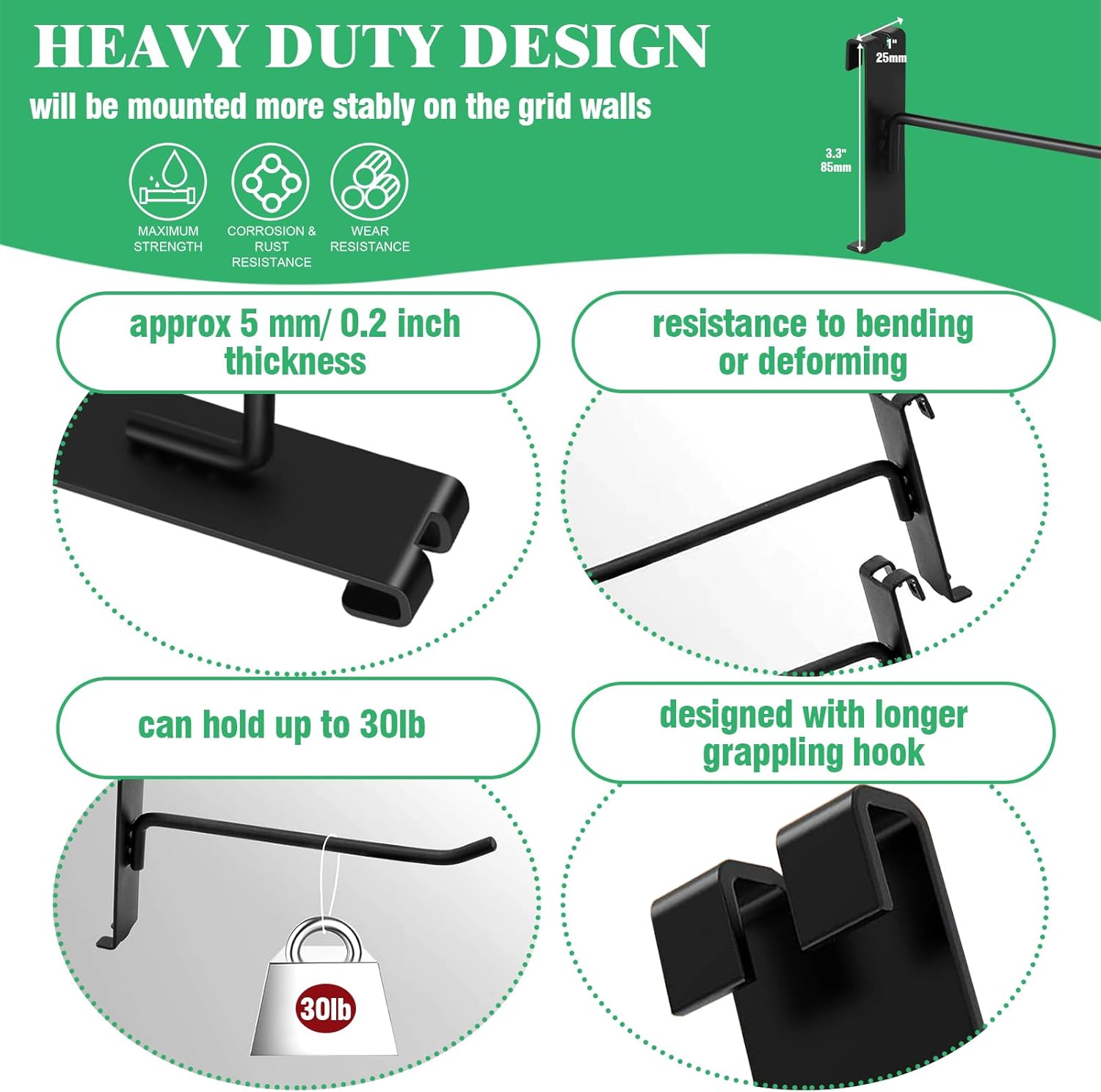 - [Strong Stability] Designed with longer grappling hook that will be mounted more stably on the grid walls. With a weight capacity of up to 20 pounds, they provide secure hanging for a variety of items with ease.