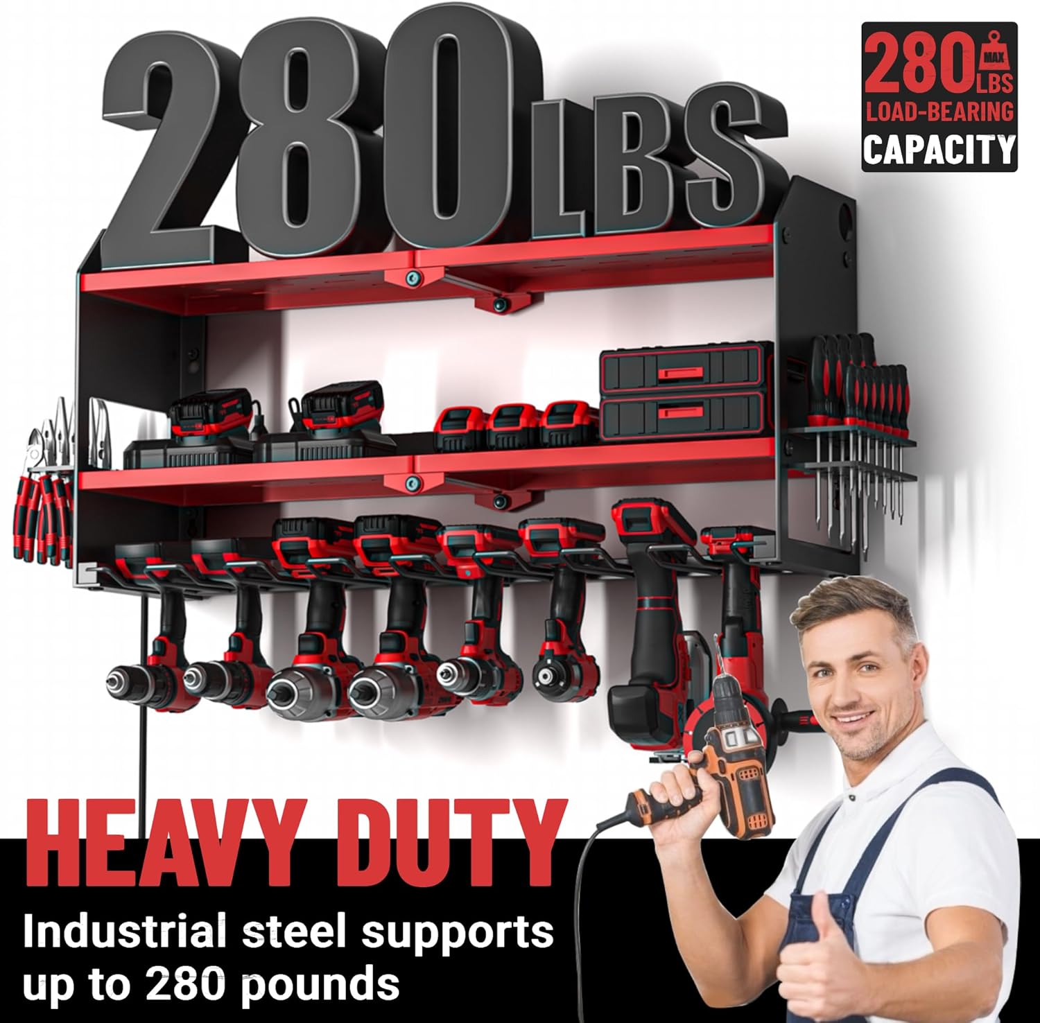 - 【HEAVY DUTY & DURABLE】:Our tool shelf is made of industrial-grade steel and equipped with high-quality mounting screws, with a total load-bearing capacity of up to 280LBS. The durable black powder coating prevents rusting and lasts a lifetime.