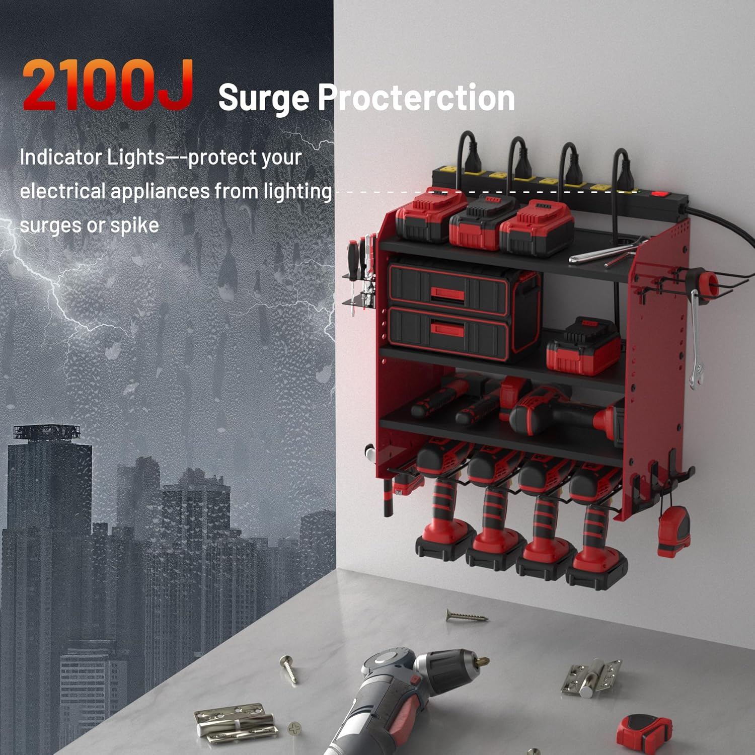 - Ssfe Charging Station--8 outlets power strip for power tool organizer solves the power needs,with 125V/15A/1875W,6ft power cord and 2100J surge protection to protect power equipment;Drill holes in single-layer boards to solve power cord clutter problems