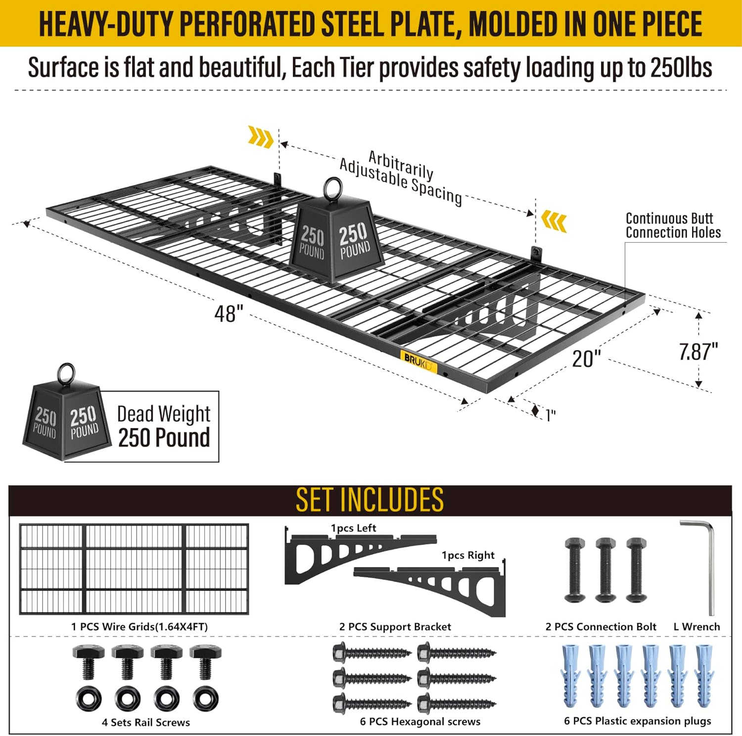 - KIT INCLUDES:Includes 1pc-Grid Shelf; 2pc-Brackets; 6pc-Hexagonal screws (Hardened ∅0.2" L/2"); 4Sets-Rail attachment bolts; 1pc- Drill bit; 1pc-Socket; 1pc-installation manual. All hardware of Brukid Professional Series Wall Mounted Shelf are under strict quality control and testing, We strive to provide our customers with a quality shopping experience, If you have any questions, Please feel free to contact us.