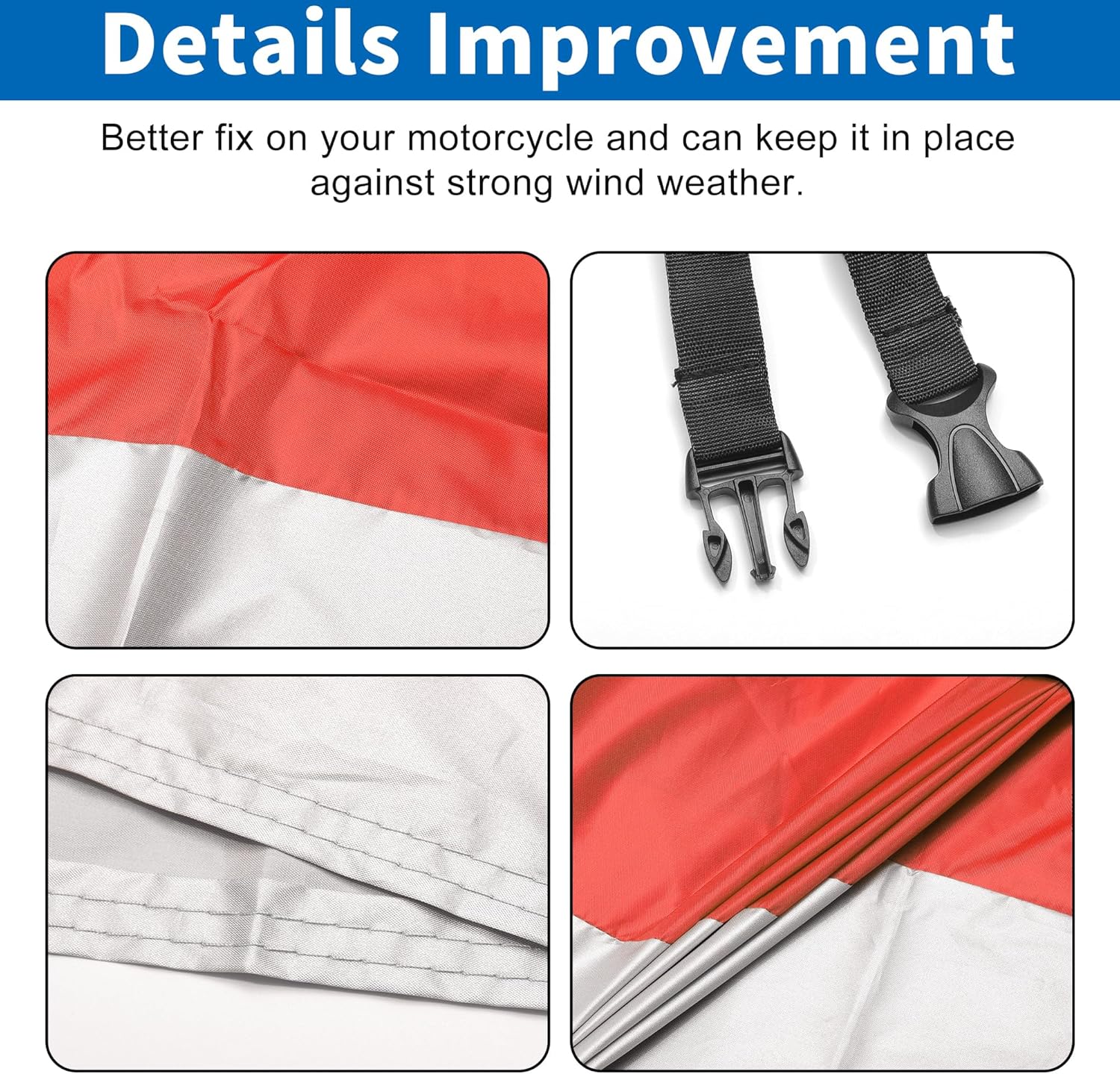 - Waterproof Windproof Upgrade: The motorcycle cover is made from 190T polyester, with the seam applied with PU glue, so it is rainstorm-proof. Adjustable Elastic Band at the lower hem of the cover can press the cover against the motorcycle body closely. In addition, there is a buckle at the bottom to prevent the cover from being blown away.