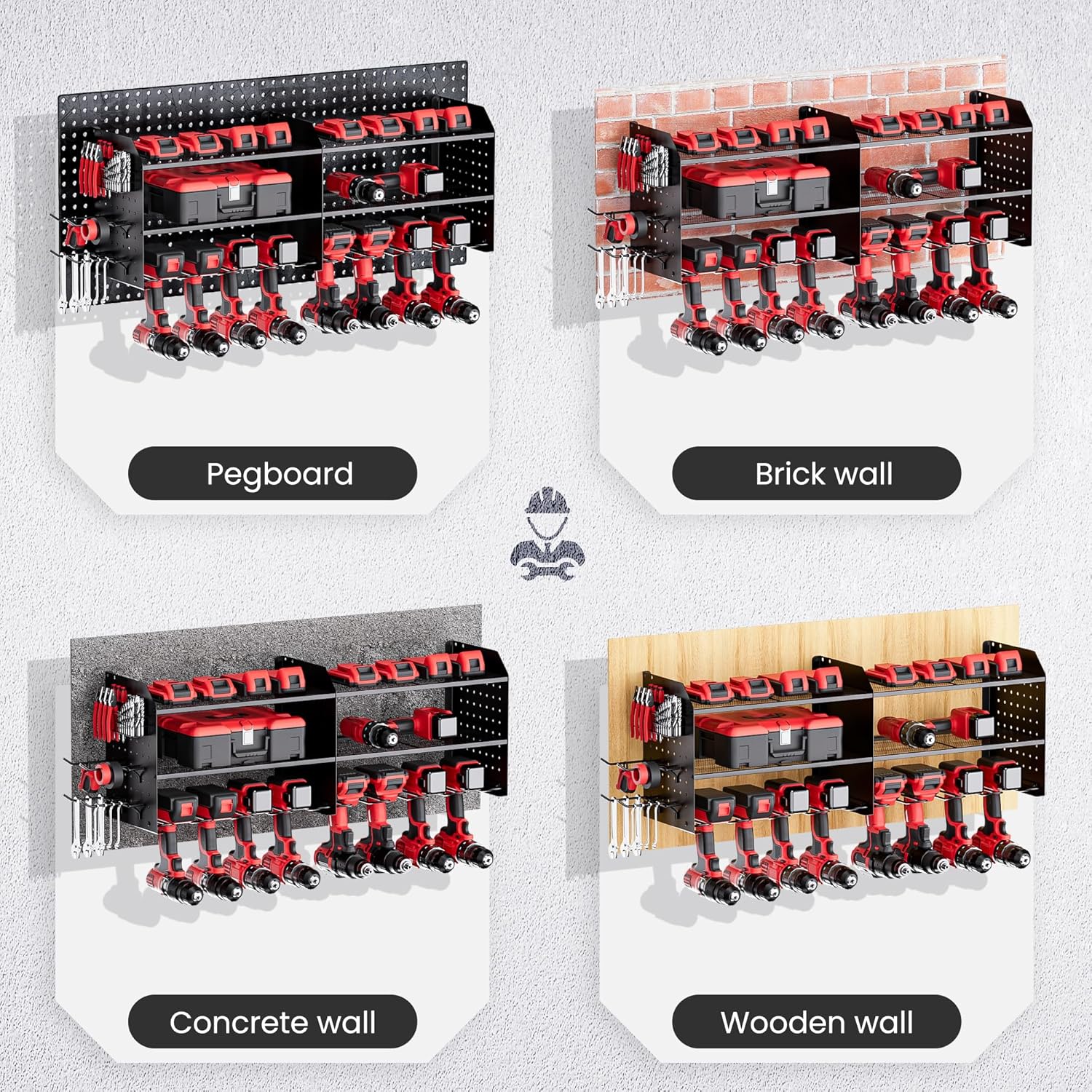 - 3-Layer Efficient Storage: First layer for organizing rechargeable tools, second layer with extra height (5.3") for garage tools, bottom layer for 4 cordless drills, side pegboards include drill bit rack, 4 long hooks, and drill rack for 2 drills