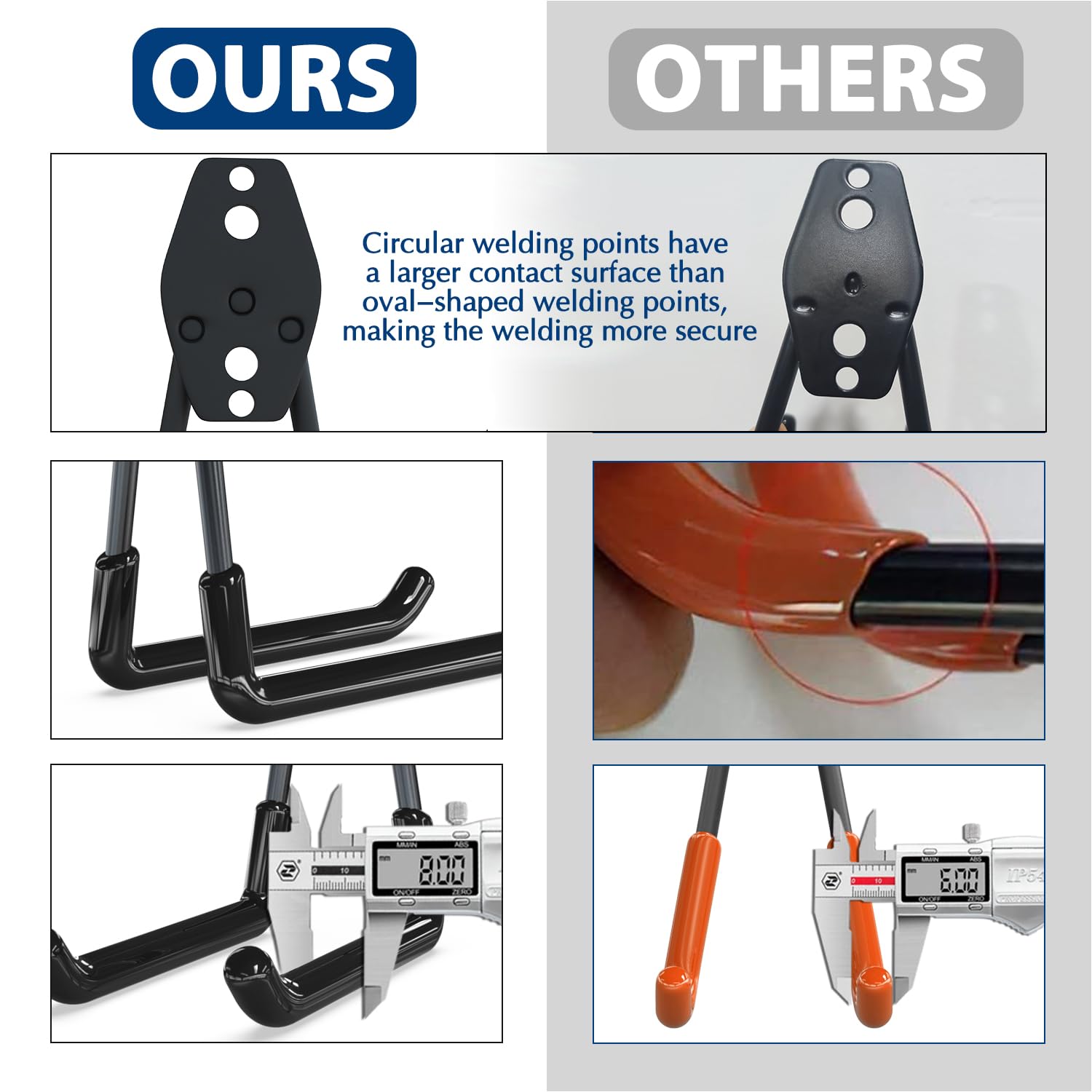 - Upgrade Design for Garage Hanging Hooks: Different from other similar garage hooks heavy duty with oval-shaped welding points, our designed circular welding points. These provide a larger contact surface between the hook and the backboard, offering higher security. With this design, there’s no need to worry about the rear steel panel splitting or falling off, a perfect choice of wall hooks for hanging heavy duty
