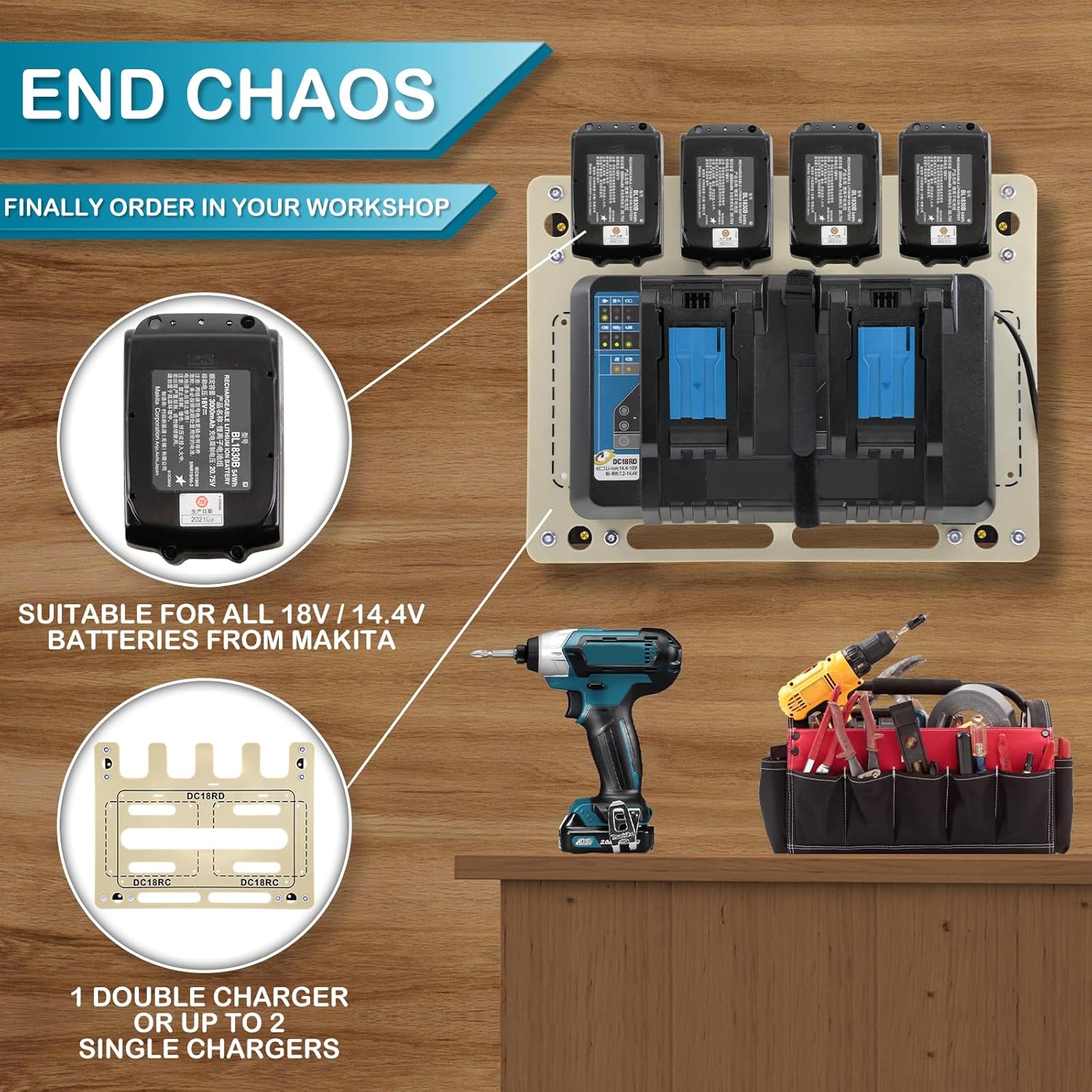 - Multi-purpose storage tool β This mount for makita battery is designed for a multi-purpose tool area and can accommodate with 2 Makita DC18RC chargers, 1 Makita DC18RD charger and 4 Makita 18V/14.4V batteries at the same time.It can effectively organize your space and make your work easier and more enjoyable.