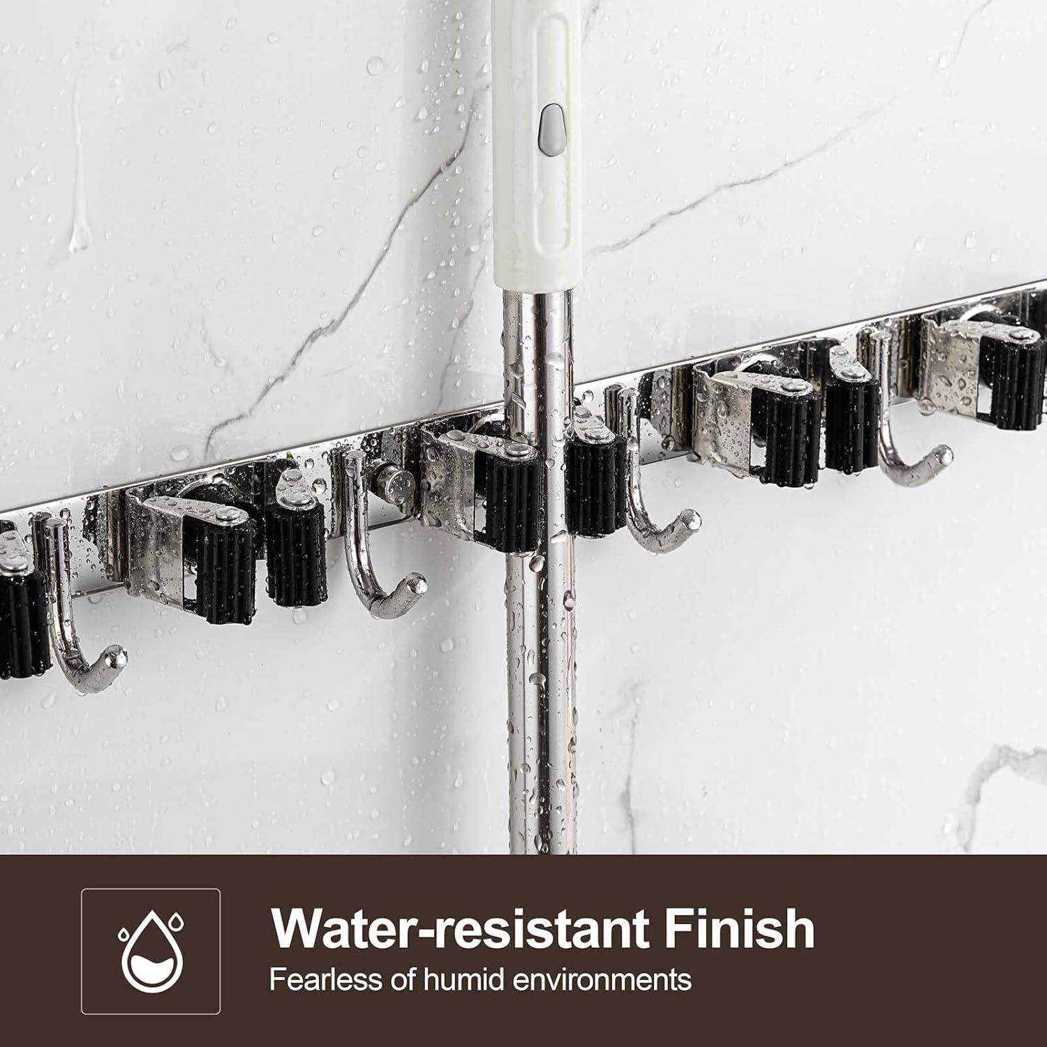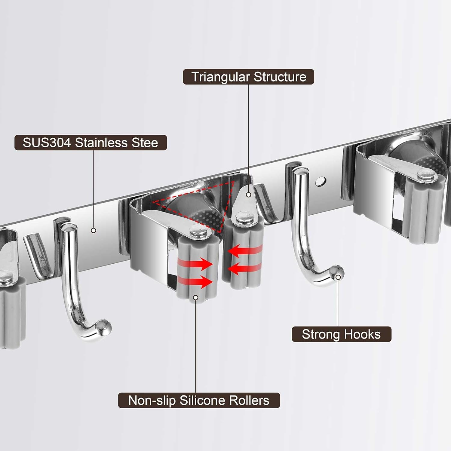 - STURDY & NON-SLIP DESIGN: Our broom and mop holder wall mount is constructed from rustproof stainless steel, offering greater durability than plastic options. It can support up to 44 lbs with screws (or 22 lbs with self-adhesive). The integrated anti-slip silicone prevents scratches and ensures a strong grip, thanks to the double rubber-gripped slots.