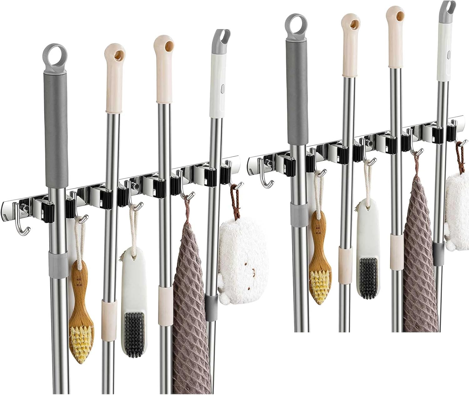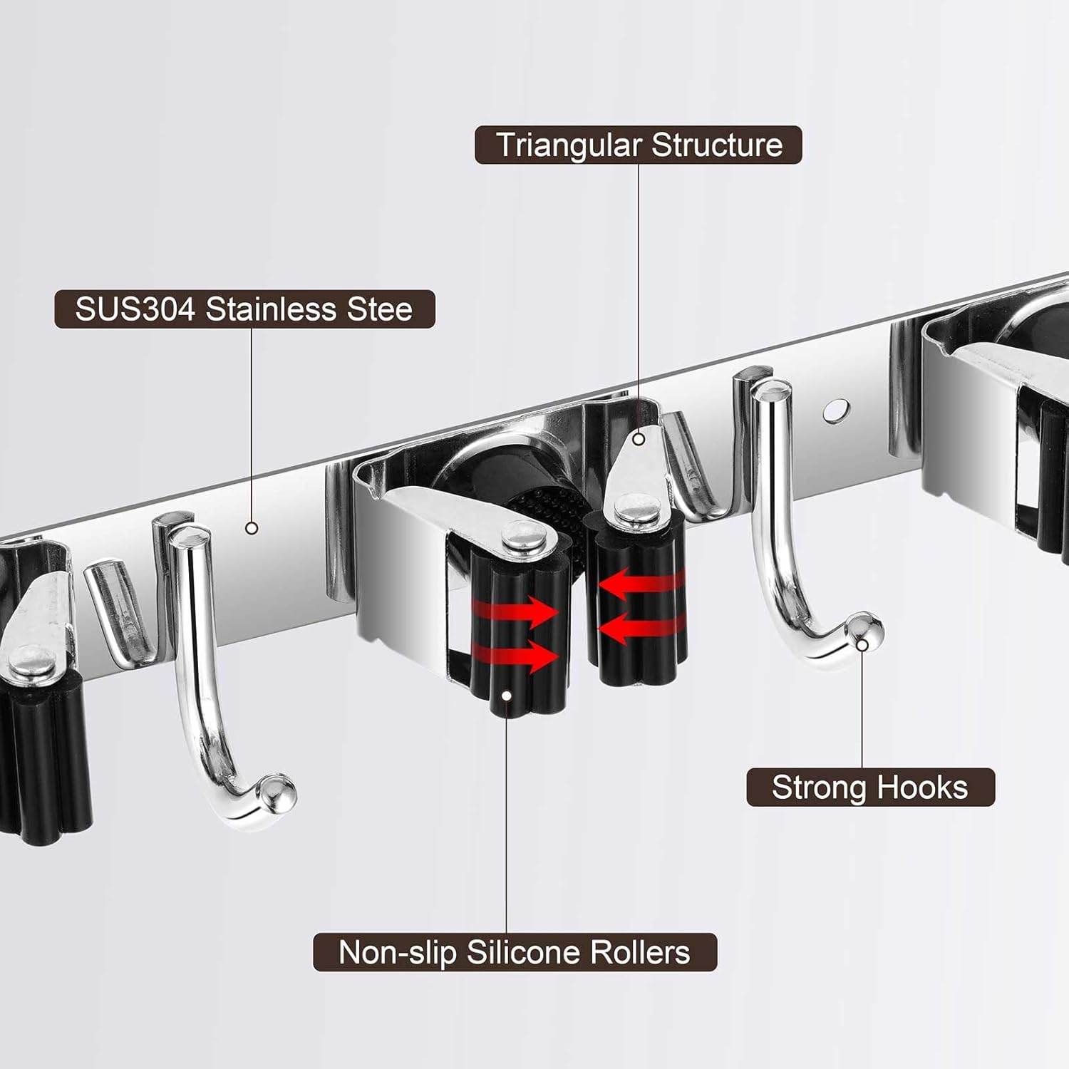 - STURDY & NON-SLIP DESIGN: Our broom and mop holder wall mount is constructed from rustproof stainless steel, offering greater durability than plastic options. It can support up to 44 lbs with screws (or 22 lbs with self-adhesive). The integrated anti-slip silicone prevents scratches and ensures a strong grip, thanks to the double rubber-gripped slots.