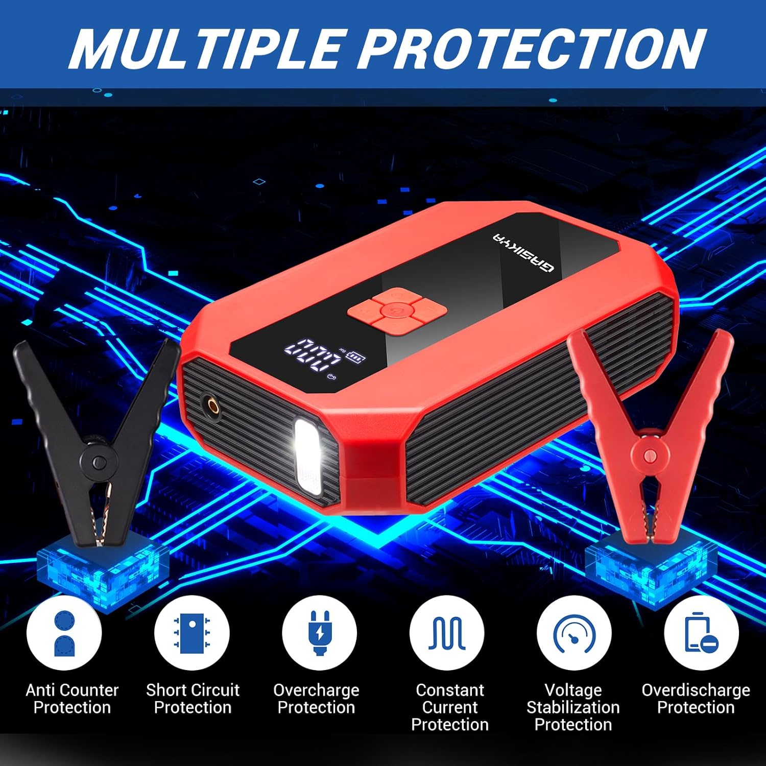 - Portable & Versatile: The portable car jump starter measures 8.27x5.28x2.04 inches, making it easy to store in your car and travel bag
