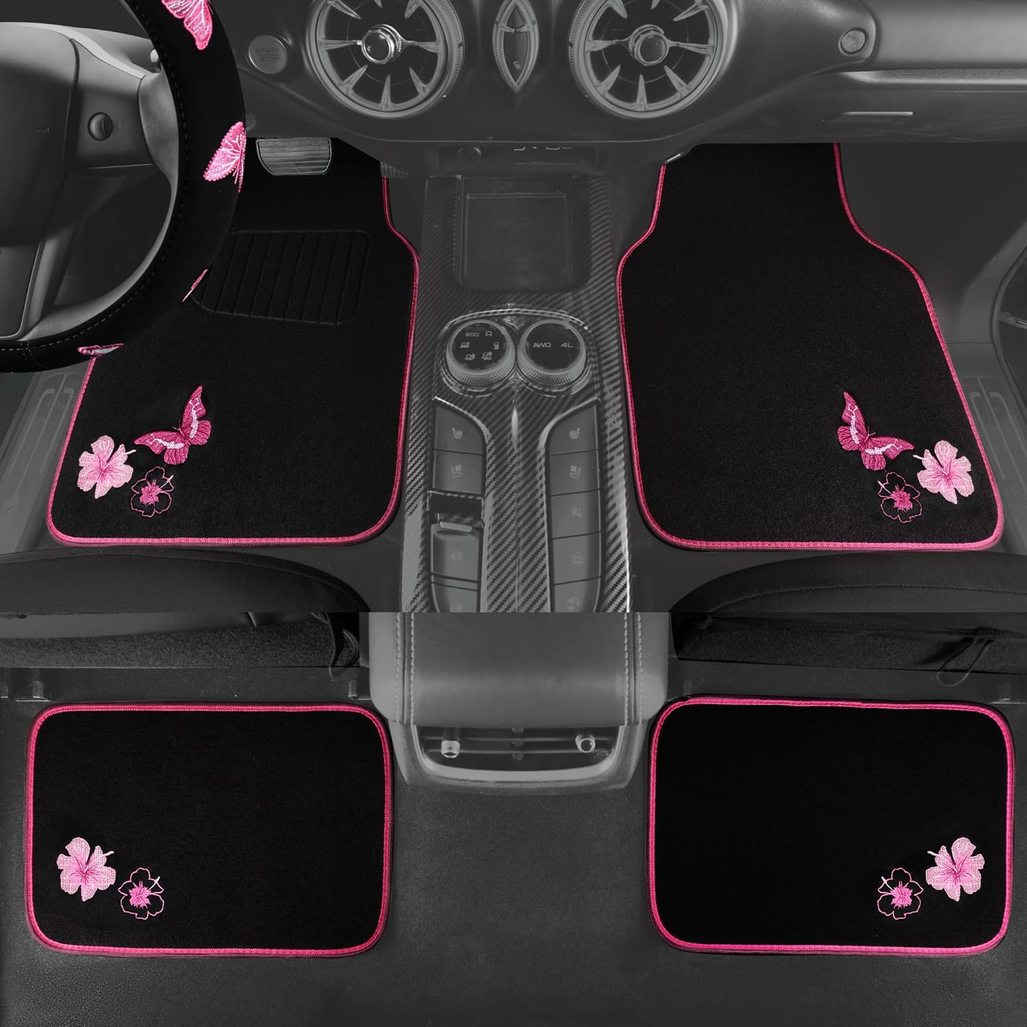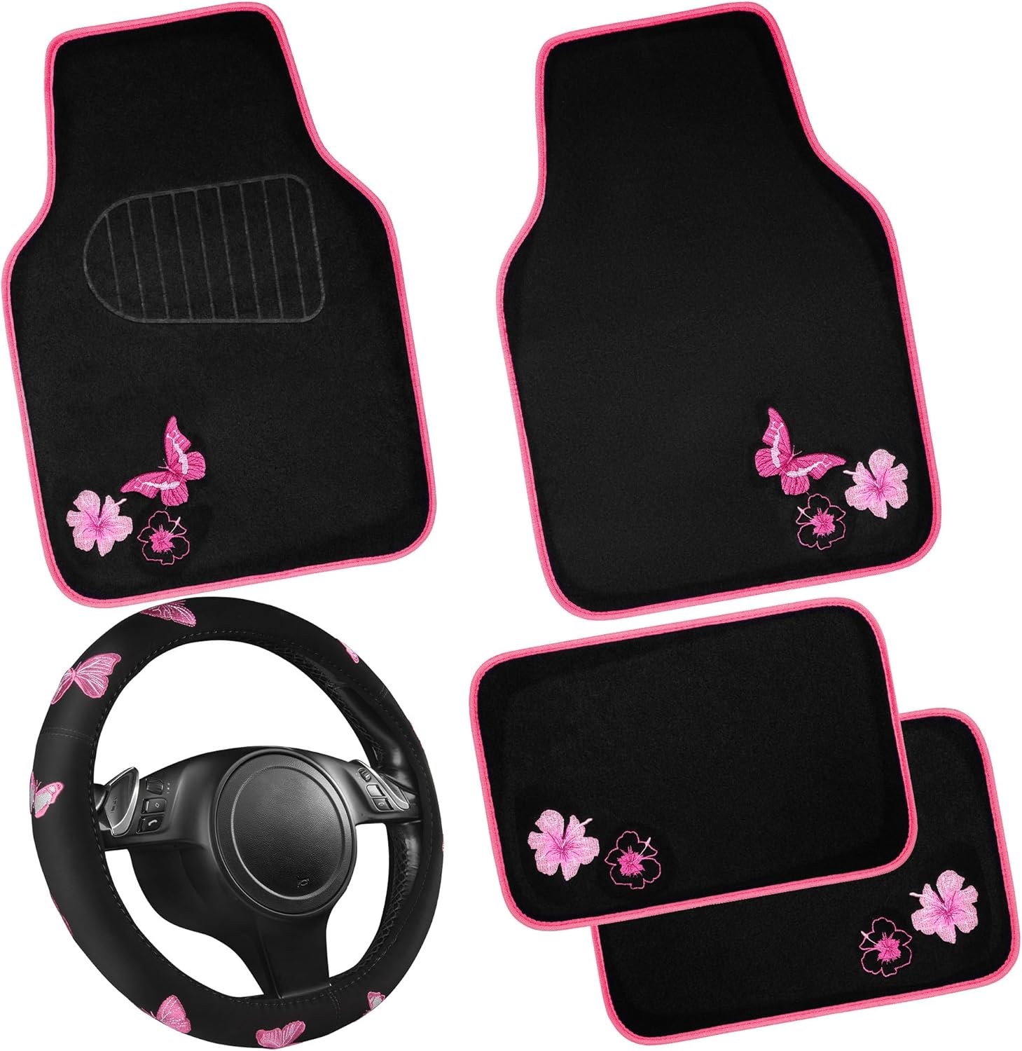 - Handcrafted Embroidery of Butterflies and Flowers - A Shining Pearl of Chinese Art. Our pink butterfly car mats and steering wheel covers set is beautiful and comfortable, perfectly complementing your vehicle's interior. Specially designed heel pads and top-quality materials ensure that your mats will last for many years. The high-quality materials also protect your steering wheel cover from sun damage, scratches, cold, and moisture.