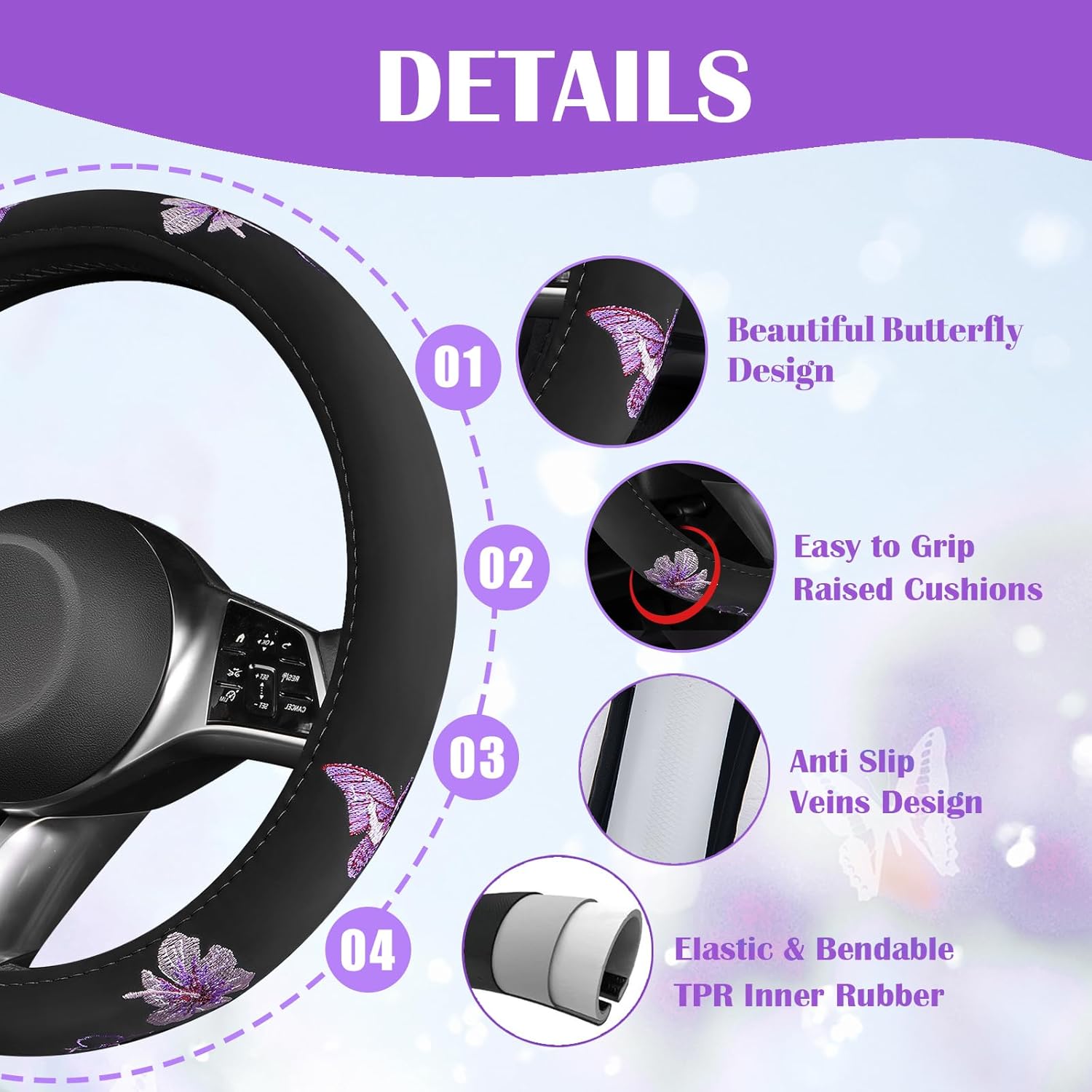 - Handcrafted Embroidery of Butterflies and Flowers - A Shining Pearl of Chinese Art. Our purple butterfly car mats and steering wheel covers set is beautiful and comfortable, perfectly complementing your vehicle's interior. Specially designed heel pads and top-quality materials ensure that your mats will last for many years. The high-quality materials also protect your steering wheel cover from sun damage, scratches, cold, and moisture.