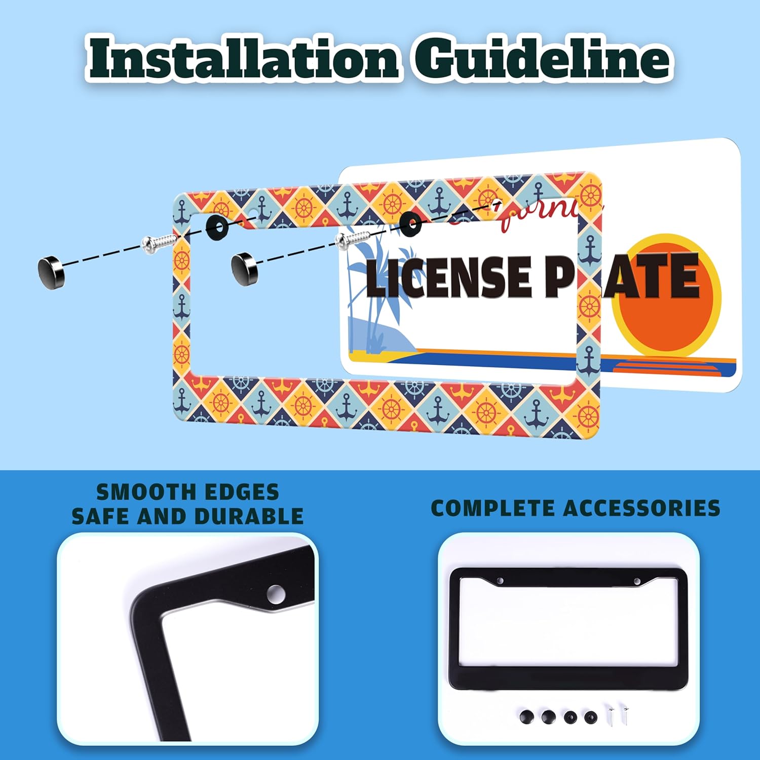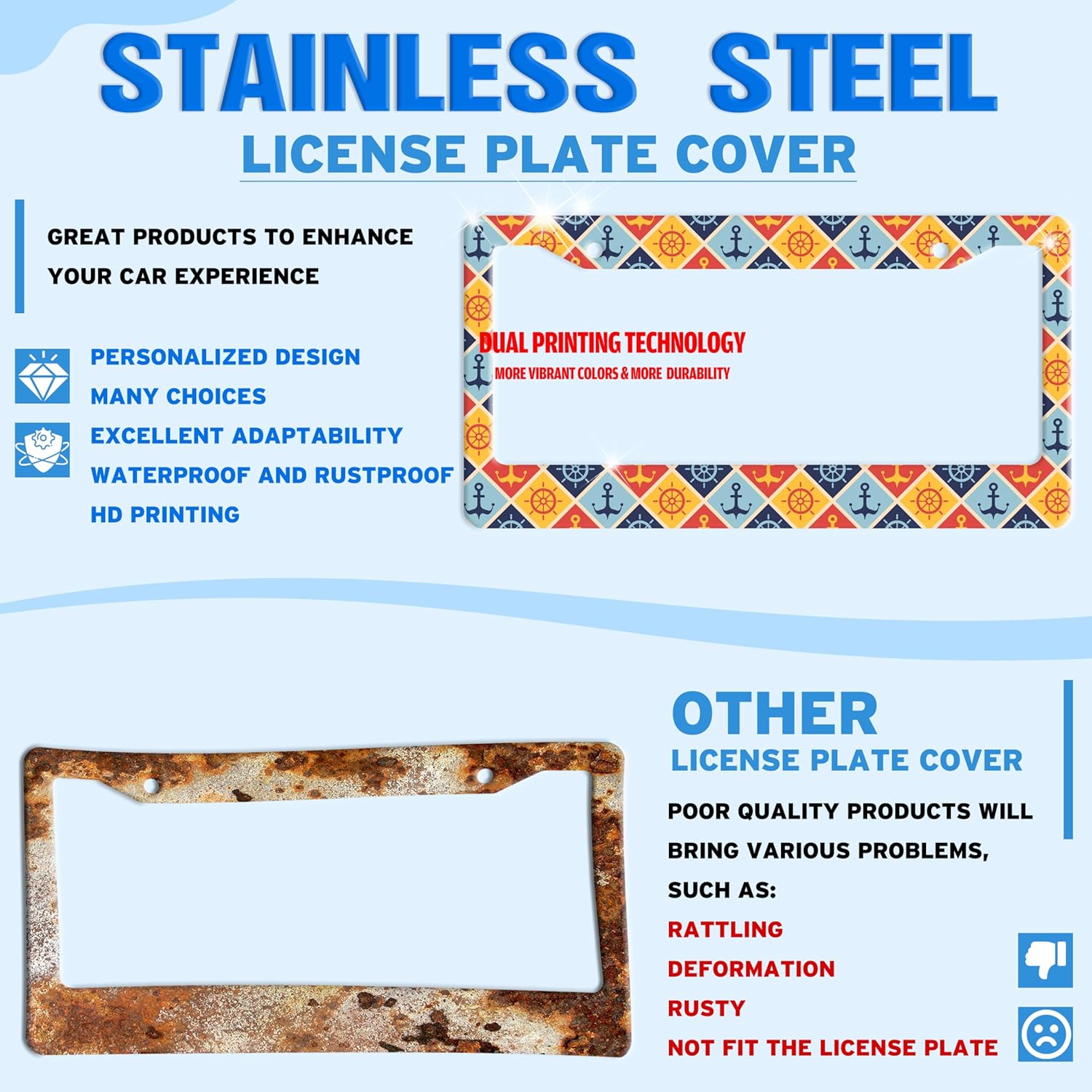 - STAINLESS STEEL LICENSE PLATE: The material is strong and not easy to bend, and can be used for a long time.The multi-layer protective design treatment improves your experience of using the license plate frame.