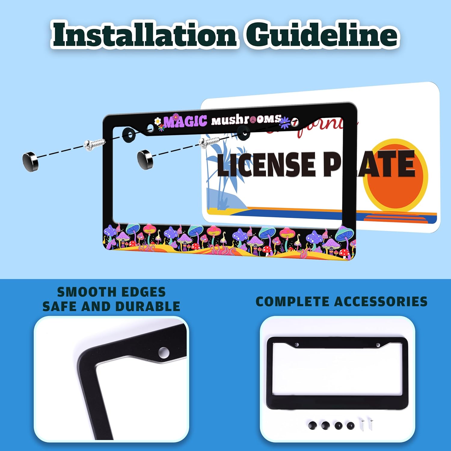 Magic Mushrooms License Plate Frame Colorful Dream Stainless Steel License Plate Holder for Front or Rear Car Tags Funny for Car Decoration Accessories with Screws 6.3 X 12.2 in for Women Men