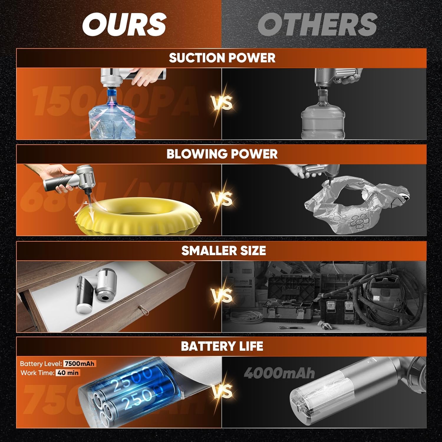 - ăLong Battery LifeăOur vacuum cleaner is small in size but powerful in function, and is equipped with 3 2500mAH high-quality batteries to achieve ultra-long standby battery life. Using type-c, you can quickly recharge it anytime and anywhere, and you can solve your cleaning, vacuuming and blowing needs anytime and anywhere.