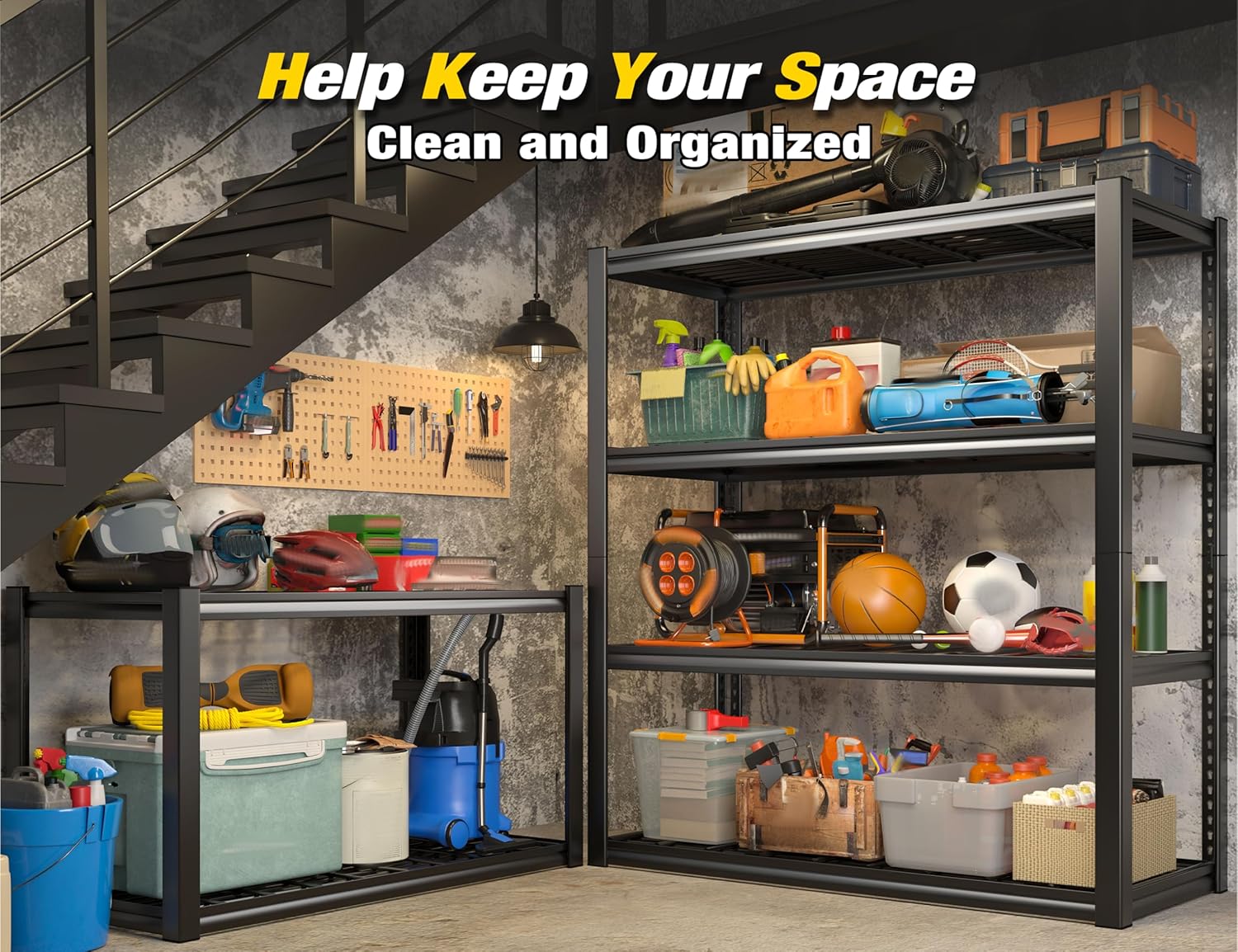 - ă40" Wide and Large Industrial Garage Storage Shelvesă40"W x 59.9"H x 19.7"D. Versatile application heavy duty shelving unit for personal use in pantry, kitchens, basement, garages, warehouse, industrial, bedroom, living room and etc. This commercial garage shelves heavy duty also works perfect for business use as goods shelves in market, warehouse, shop, automobile repair. Large size capacity for more and better garage storage and organizer options