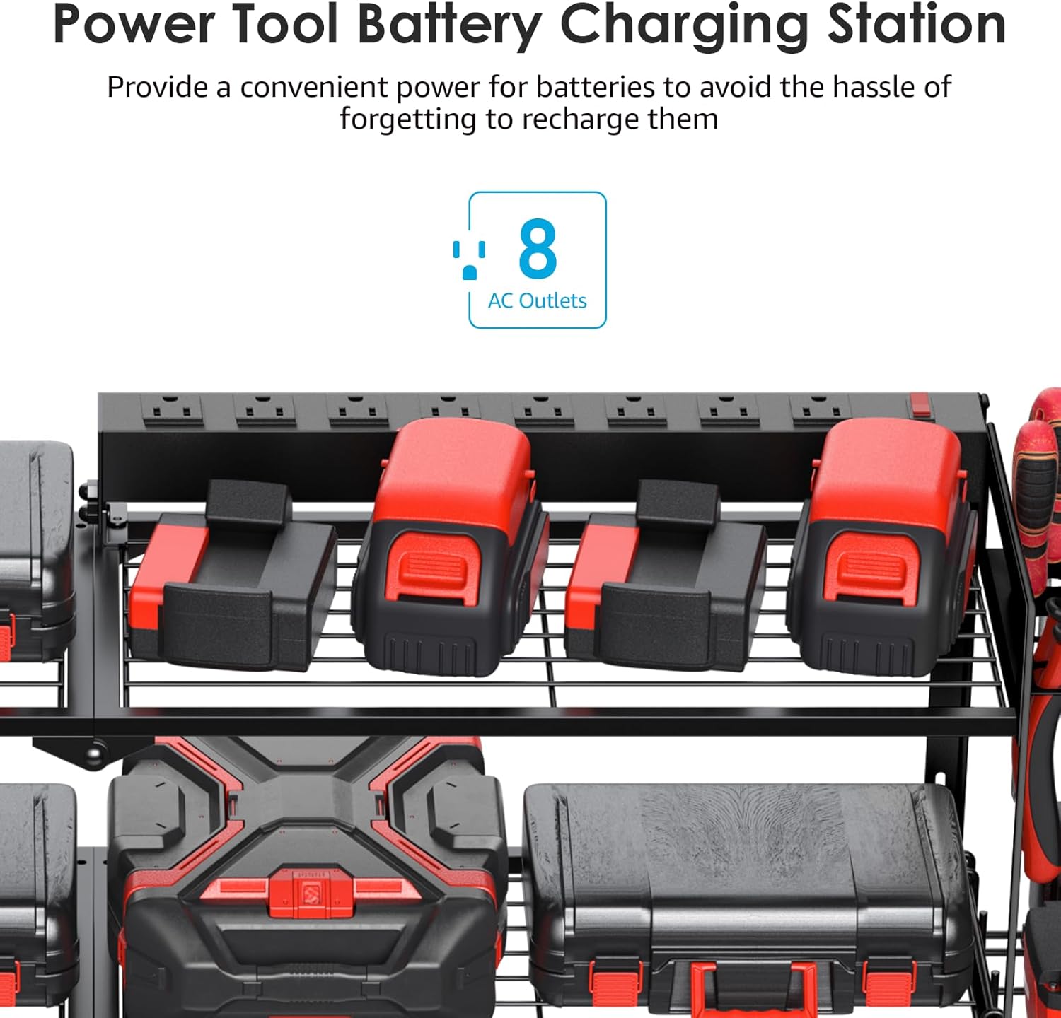 - Large power tools and batteries organizer with charging station, and have a single place to live. It doesn't take long to find them, will improve efficiency and come with integrated 8 outlets power strip. Made entirely of metal, strong and durable.