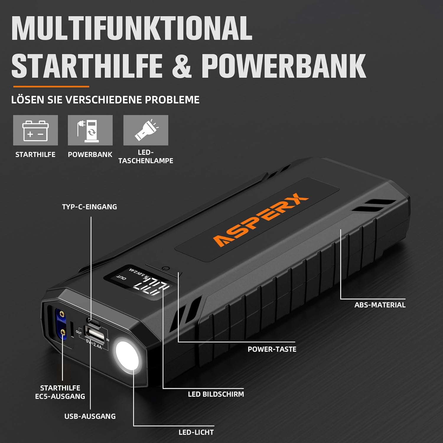 AsperX Car Jump Starter, 4000A Peak Battery Starter for All Gas or 10.0L Diesel Engines, 12V Battery Starter, Jump Box with USBA, Lithium Battery Booster with Built-in LED Light
