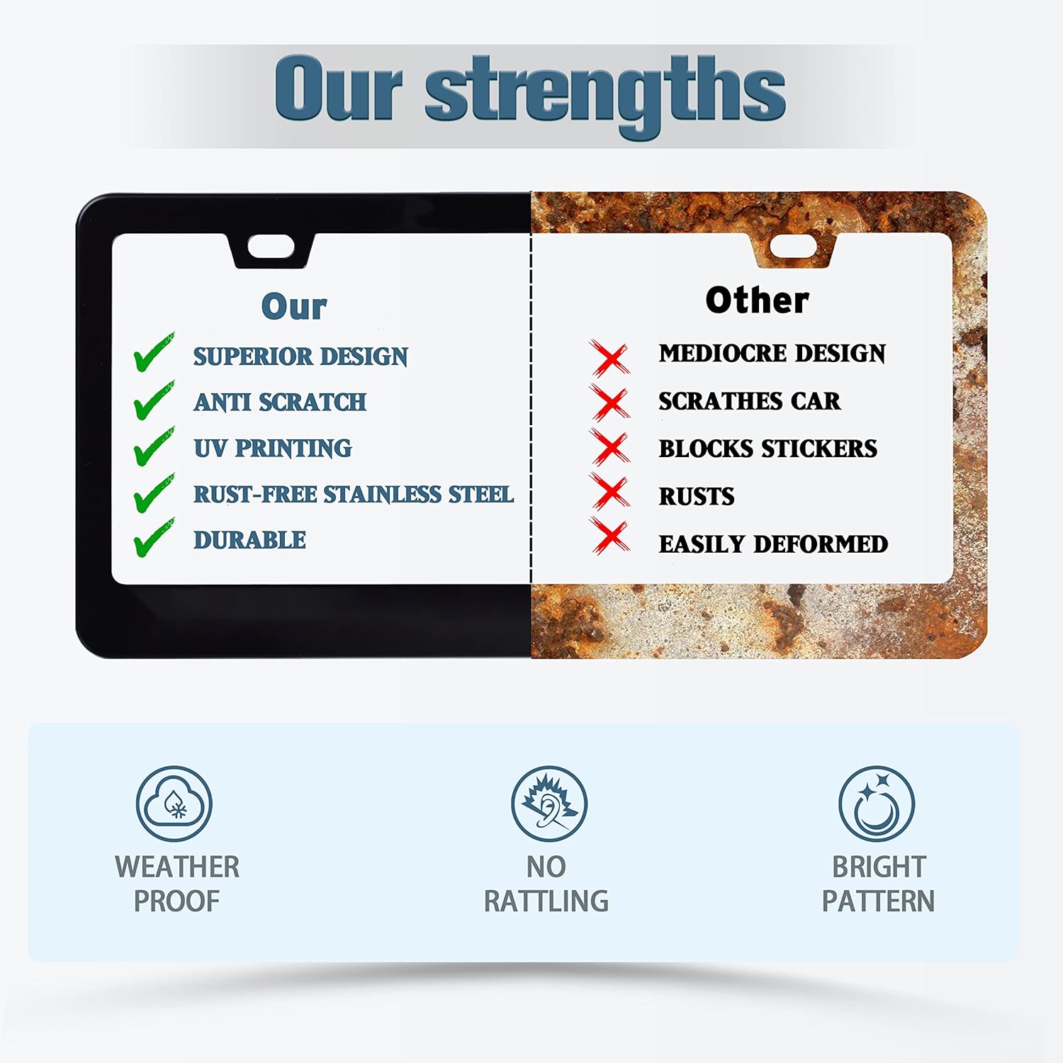 - Inner clip on the back: The license plate frame has an inner clip on the back that can be fixed to the license plate without making any noise, so you can use it with confidence.