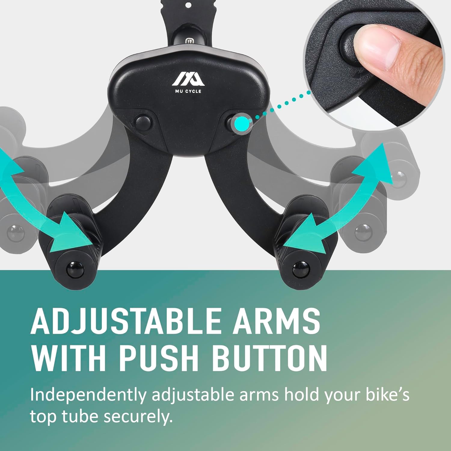 - Bike Frame Protection – Soft rubber-coated hooks prevent scratches to aluminum, carbon, and steel frames. Includes elastic strap to stabilize the front wheel and prevent wall scuffing.