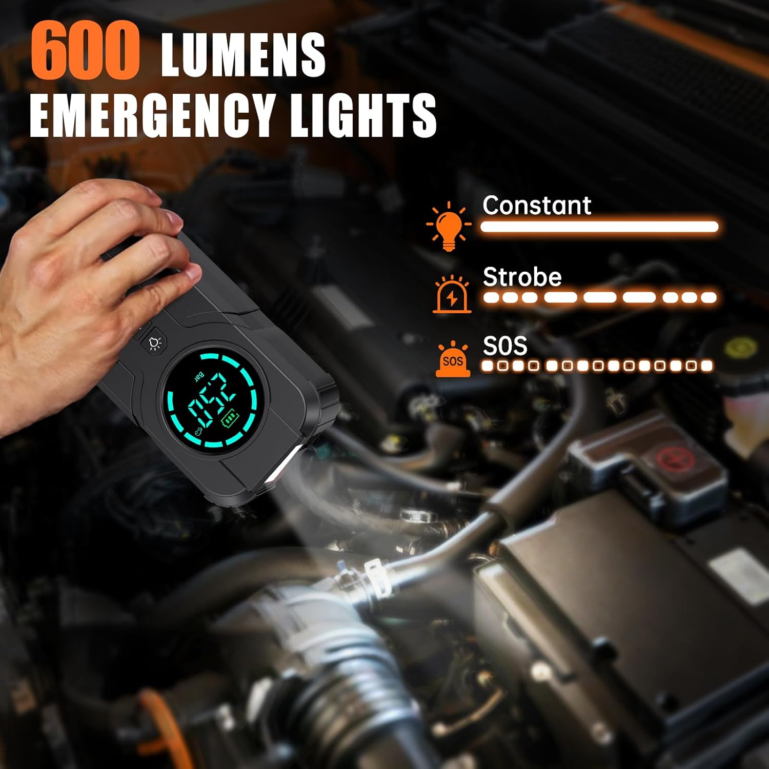 - â¤ăFast Tire Inflation and LCD ScreenăThis Car Jump Starter features a clear, easy-to-read LCD screen and delivers up to 150 PSI. Equipped with 4 multi-function nozzles, it's perfect for cars, motorcycles, bikes and sports equipment. Keeps you ready for any tire emergency. Press the jump starter light button can switch 3 LED light modes (Flashlight, SOS, Strobe), perfect for nighttime emergencies, also dual Type-C ports for charging mobile devices.