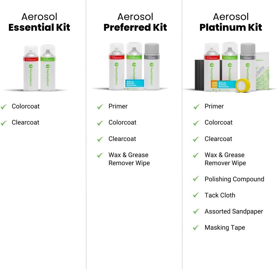- Aerosol Platinum Touch Up Paint Kit includes automotive primer, Colorcoat, Clearcoat, and essential tools: Wax & Grease Remover Wipes, Tack Cloth, sandpaper, Polishing Compound, and Masking Tape. Coverage: 3-4 cans for hoods/trunk lids, 2-3 cans for bumpers, 1 can for mirrors. Perfect for car paint scratch repair.