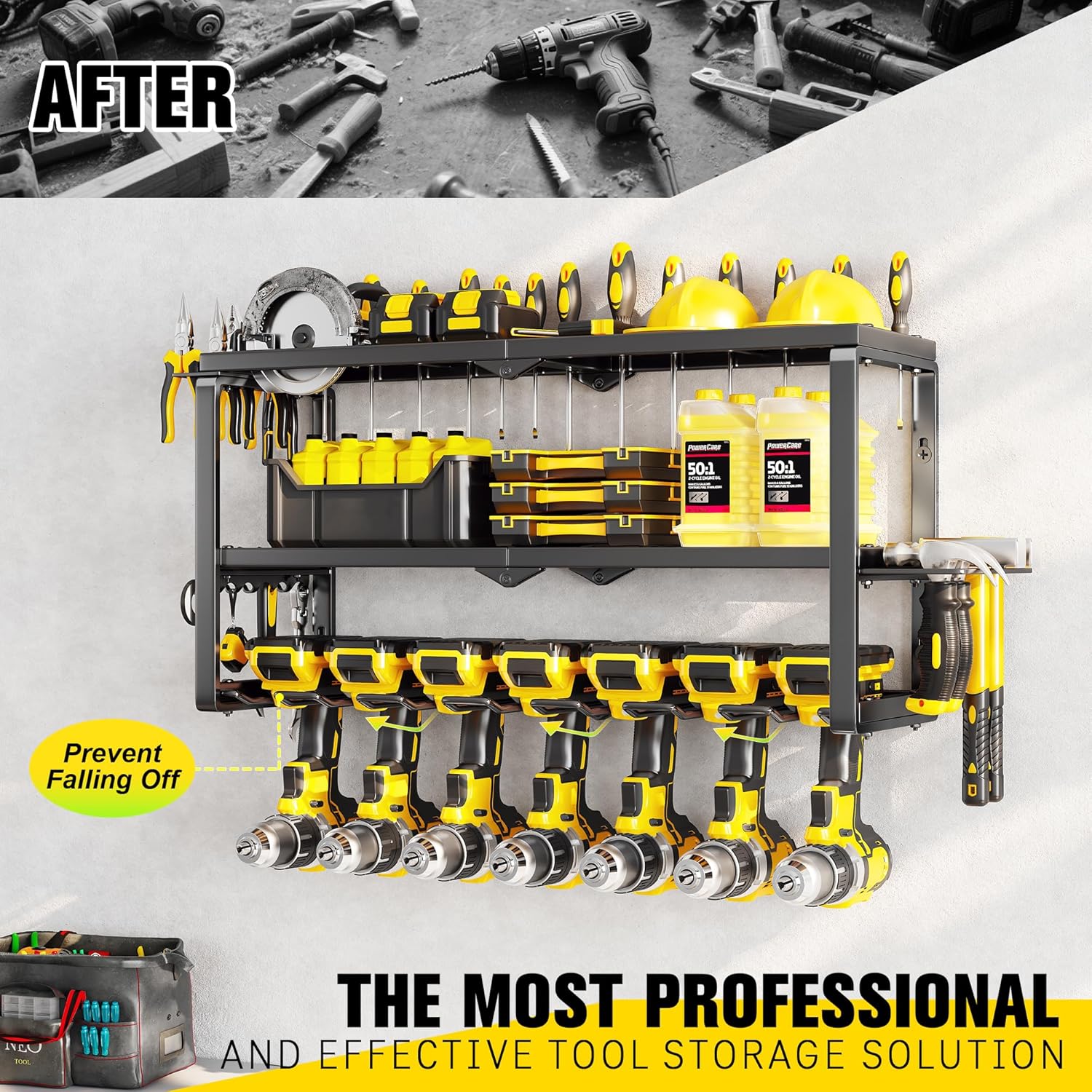 Power Tool Organizer Wall Mount - 300Lbs Load 3 Layers Storage Rack with 7 Drill Holders for Drills Cordless Tools. Heavy Duty Iron Garage Tool Organizer Storage for Workshop Shed Pegboard Basement