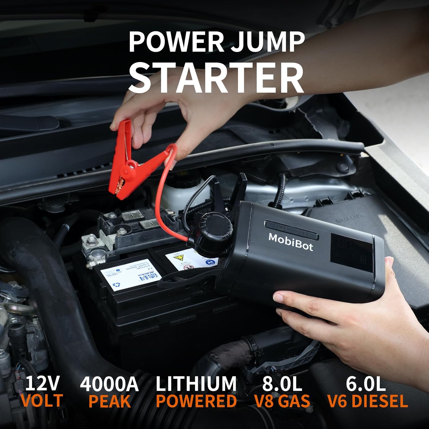 - [High Performance Car Jump Starter] Powerful and safe. With boosted 4000A cranking current, the car battery jump starter battery pack can instantly restart your 12V vehicles (specially for up to 8.0L gas/6.0L diesel) even at -4~140โ, support more than 1000+ recharge cycles. This jump box for car battery standby for about 24 months, always ready to help.