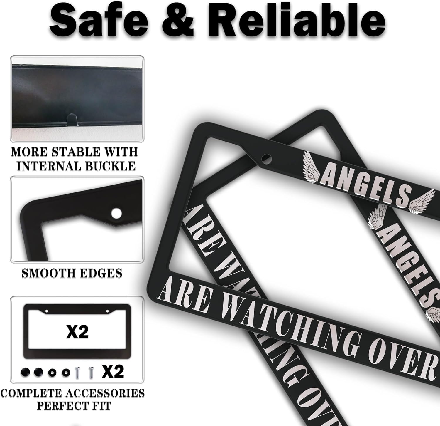 Car Plate Frames Black and White License Plate Protector Angels are Watching Over Me Universal Aluminum Car Accessory 2 Pack with Screw Covers Set