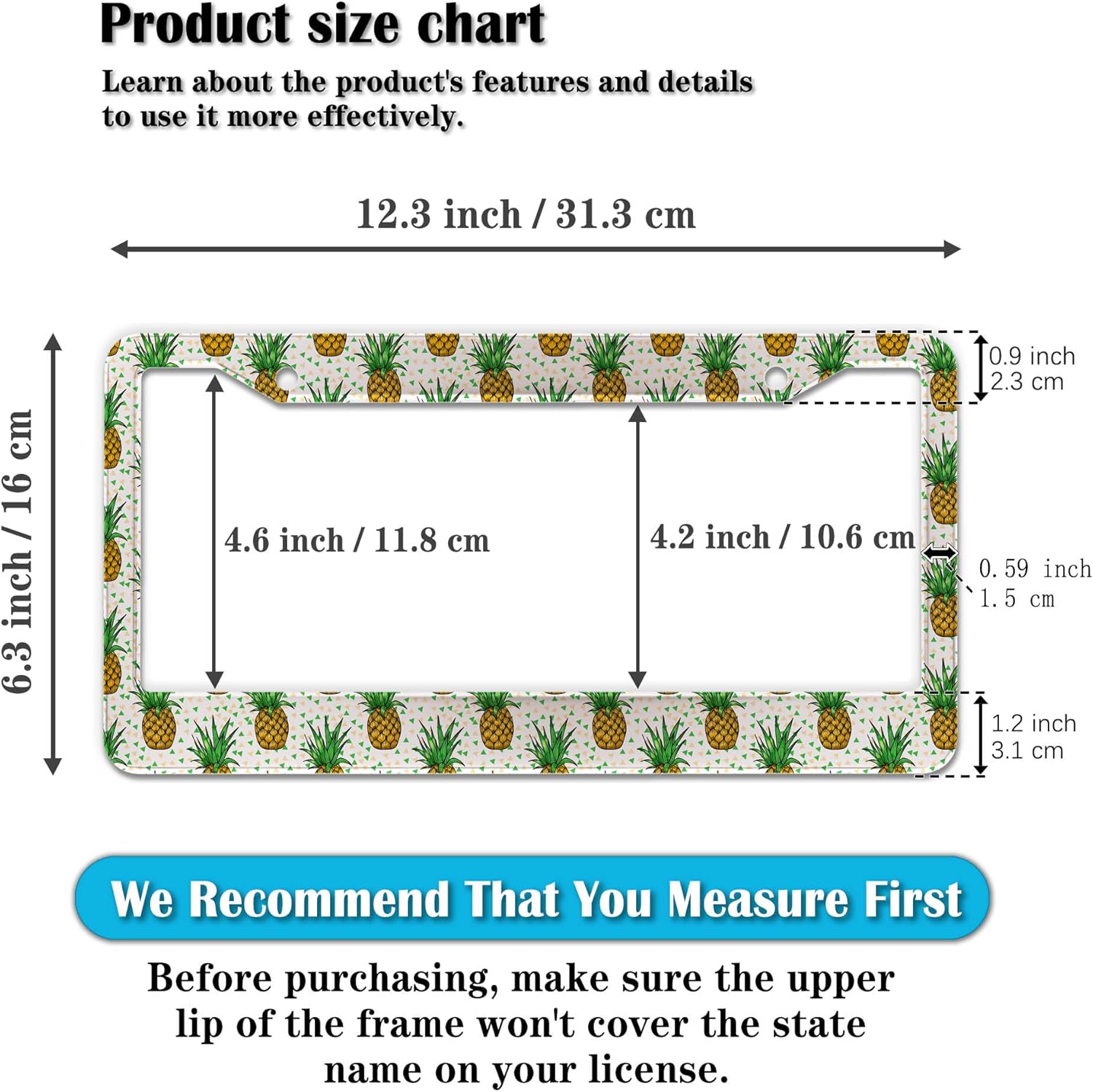 - STANDARD FRAME SIZE: Ensure a perfect fit by checking the dimensions to avoid covering your state name. These frames are specifically designed to fit standard American license plates measuring approximately 12.3" x 6.3" (16 x 31 cm). for most license plates in the U.S.