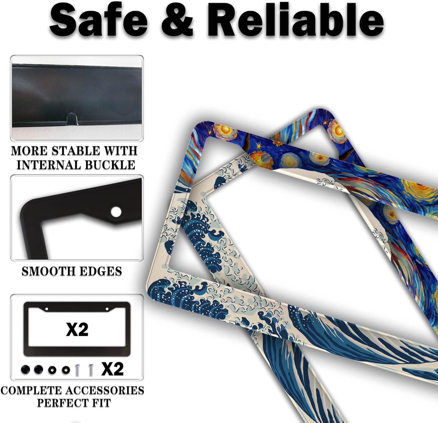 Car Plate Frames for Women Multicolor License Plate Protector for Men Starry Night Big Wave Aluminum Metal Car Accessory 2 Pack with Screw Covers Set