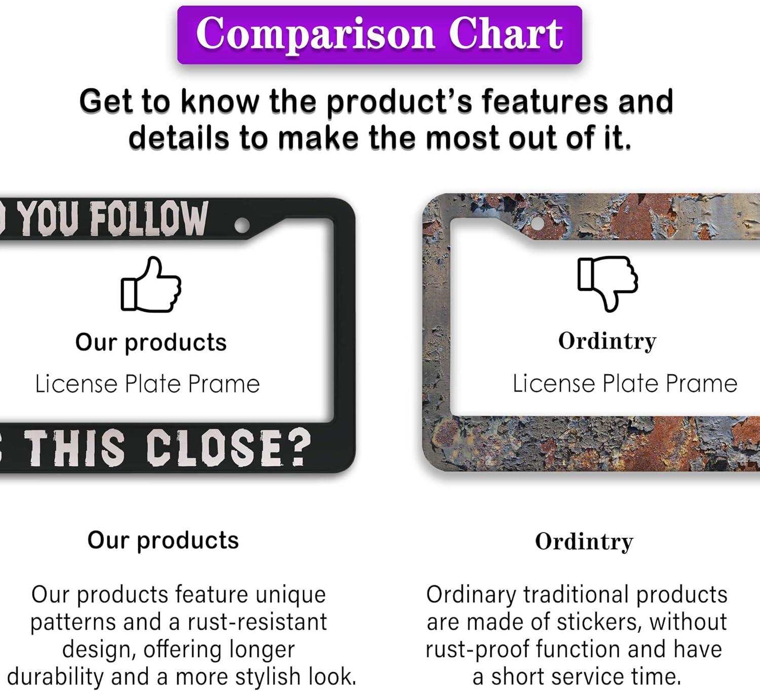 - FUNNY DESIGN: Featuring a unique and customized design, this license plate frame creates an eye-catching and bold statement for your vehicle. Not only does it add a touch of personality to your car, but it also makes for a great holiday gift, souvenir, or decorative piece for family, friends, and colleagues. Elevate your vehicle's style while sharing a laugh!