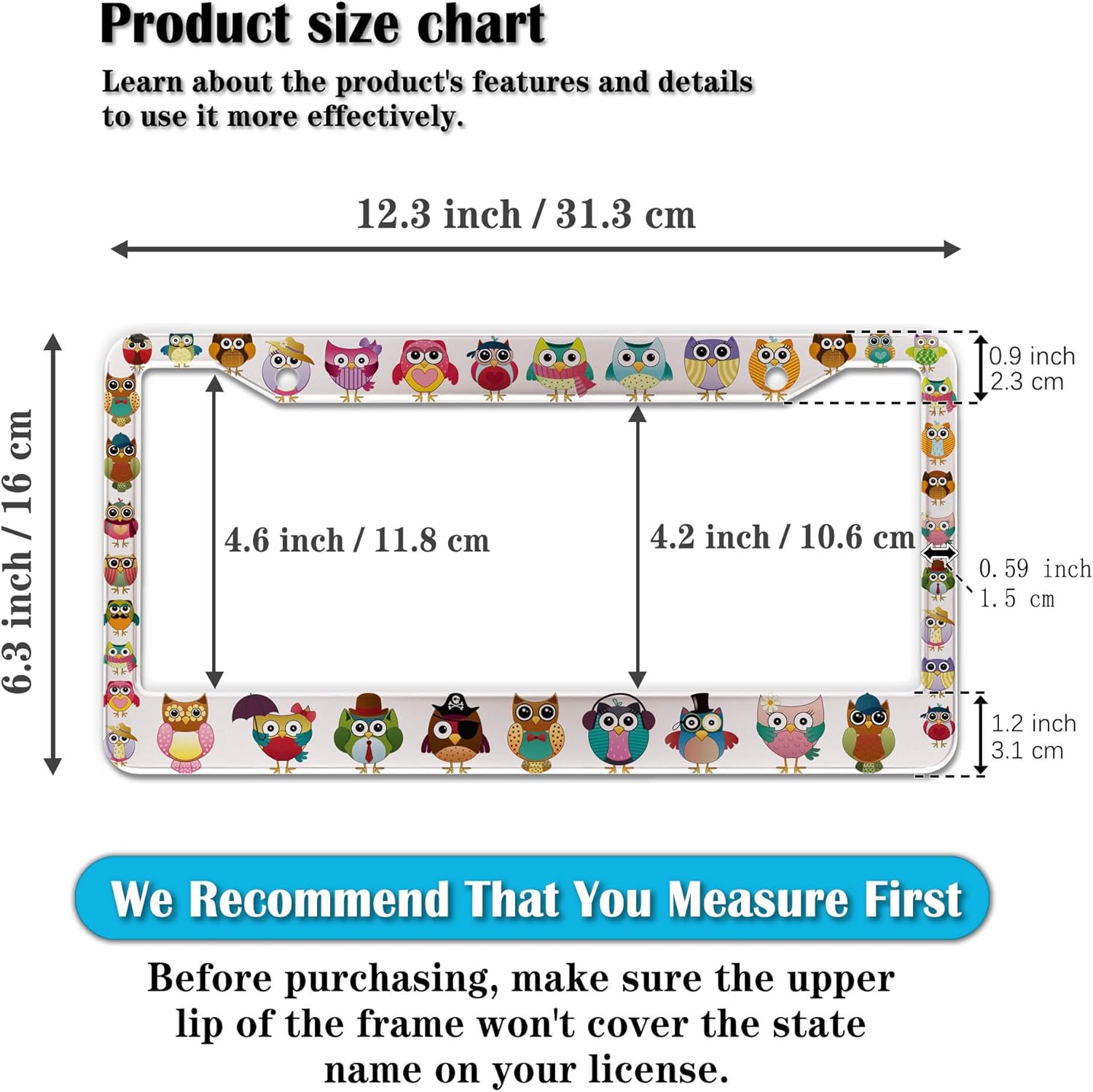 - STANDARD FRAME SIZE: Ensure a perfect fit by checking the dimensions to avoid covering your state name. These frames are specifically designed to fit standard American license plates measuring approximately 12.3" x 6.3" (16 x 31 cm). for most license plates in the U.S.