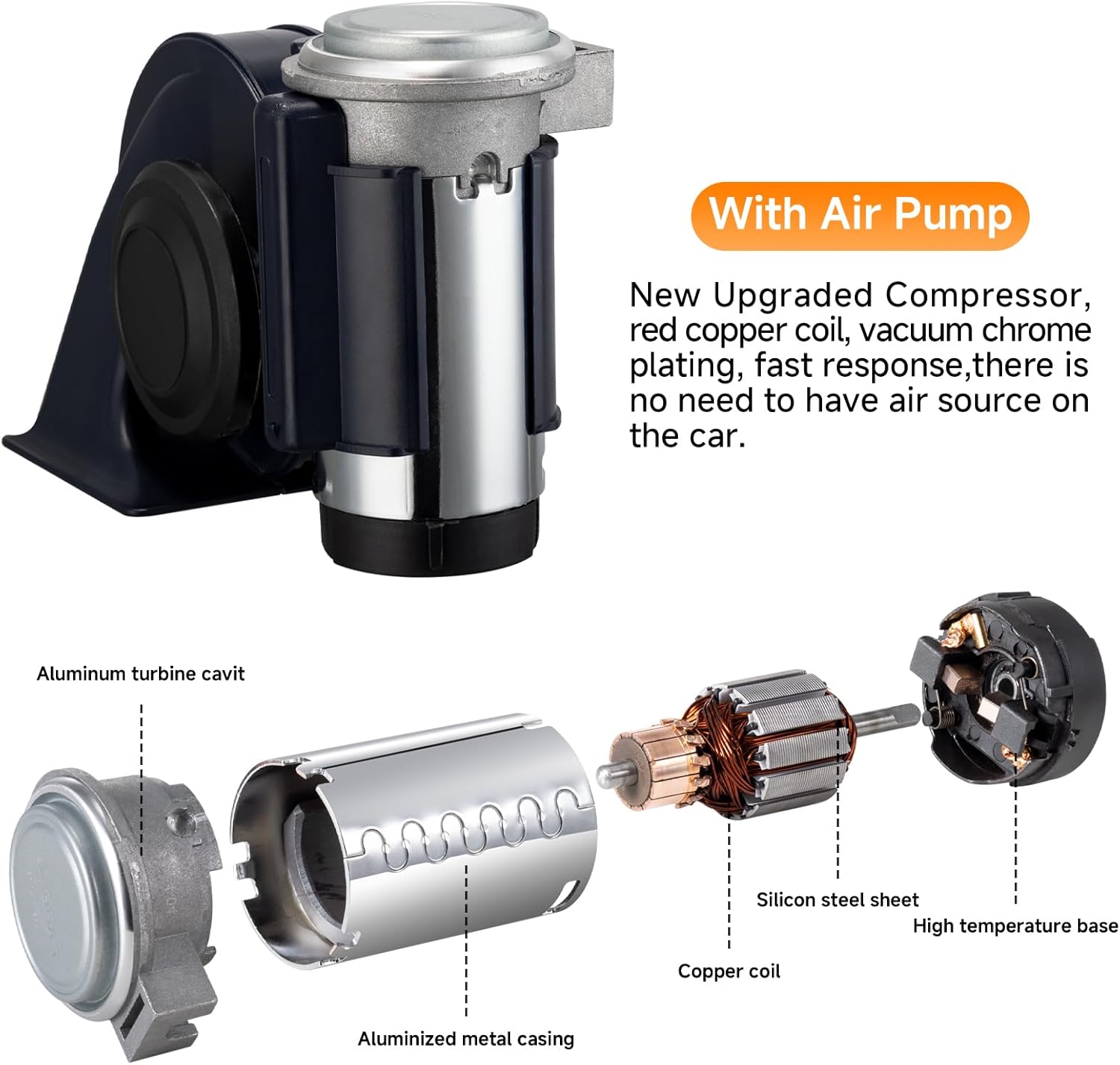 - ăInnovative Designă: Our air horn features an extremely powerful directly injected mini-compressor paired with a snail design, up to 150DB ! The sound is harmonious, loud enough, and the sound quality is excellent. All integrated into one small but powerful device